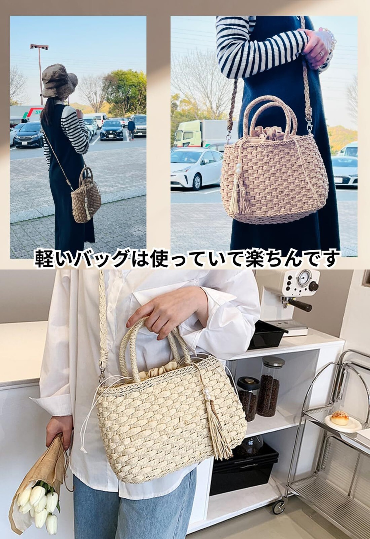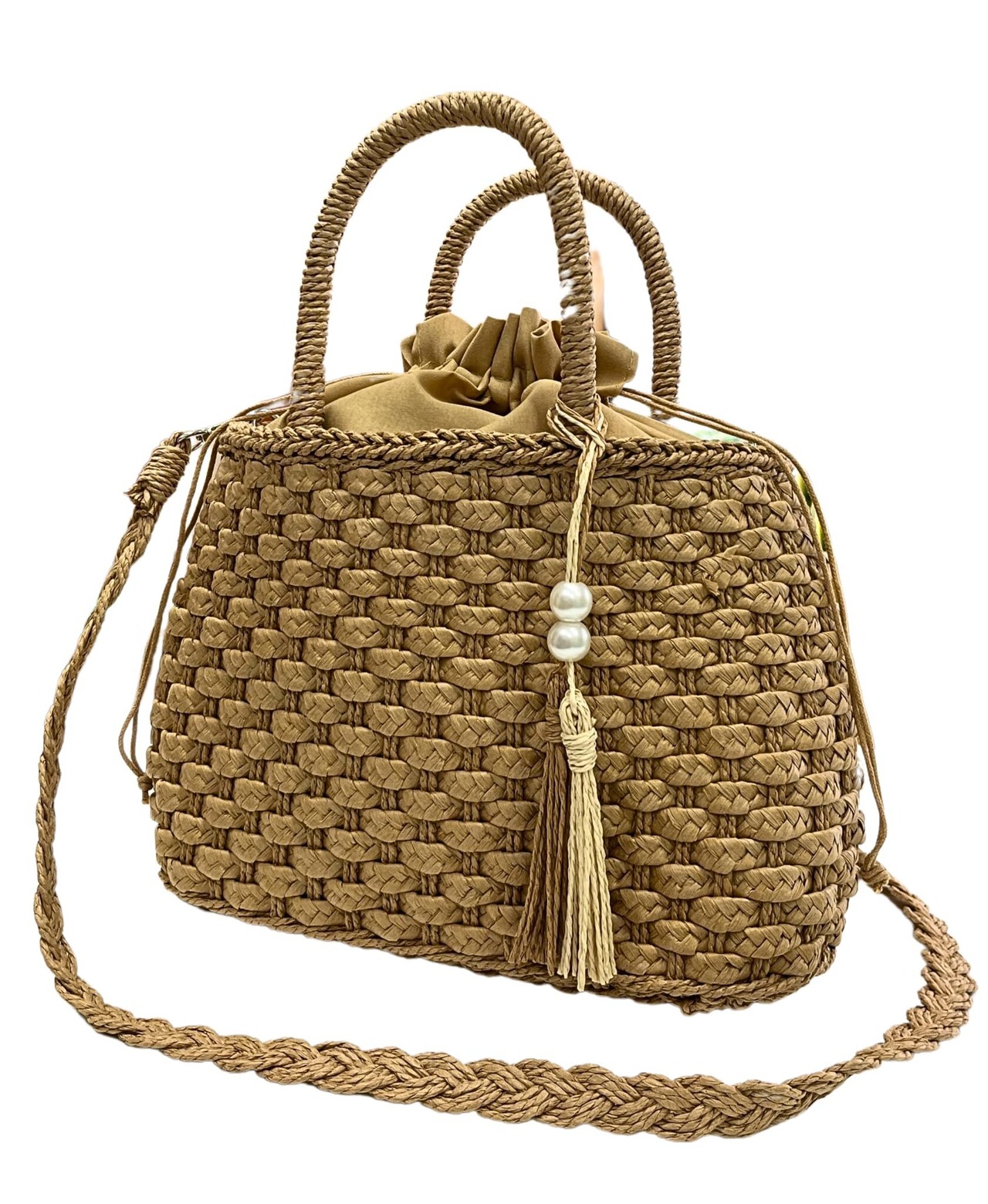 [kanaelun] レディース 手編みバッグ 巾着付き ハンドバッグ ショルダーストラップと チャーム付き 2カラー