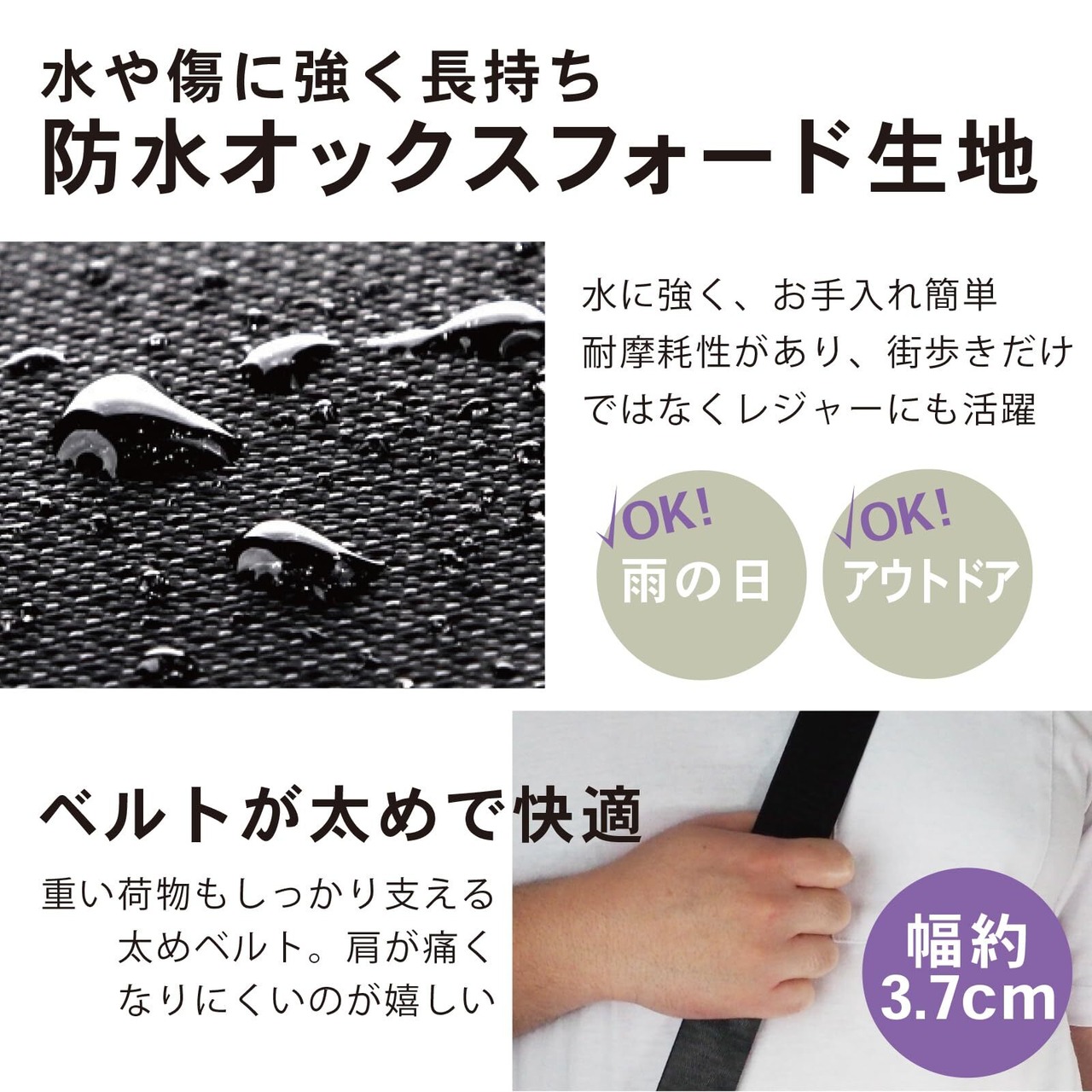 【防水・耐久性に優れたオックスフォード生地】雨の日でも気にせず使える、防水仕様のオックスフォード生地を採用。丈夫で型崩れしにくく、長く愛用できるのも嬉しいポイント。突然の雨や移動中の汚れ、うっかり飲み物をこぼした時などから、大切な荷物を守ります。日常のあらゆるシーンで、頼れる相棒となるでしょう