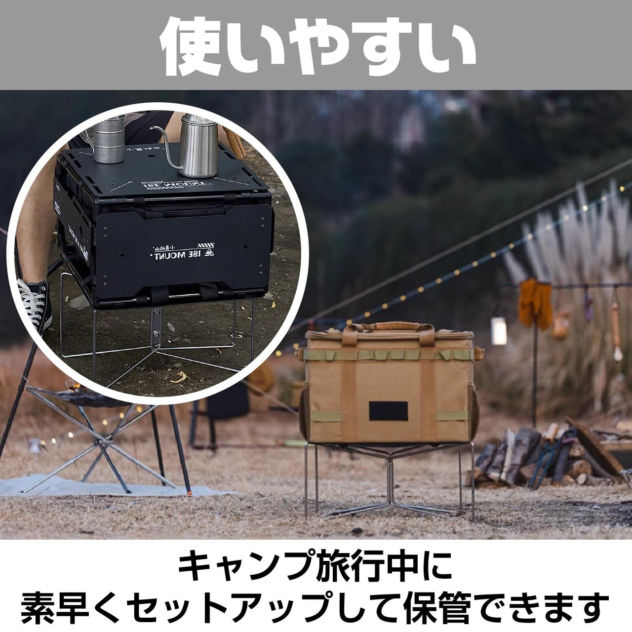 【アウトドアの救世主、マルチに使える折りたたみ式収納スタンド】このスタンドはクーラーボックスだけでなく、キャンプ道具や小物類の収納にも最適です。地面に直接物を置く必要がなくなり、砂や土、湿気による汚れや劣化を防止します。折りたたみ式で使わない時はコンパクトに収納でき、キャンプ場や釣り場での限られたスペースを有効活用できます。アウトドア愛好家なら持っておきたい、便利で実用的な必須アイテムです。