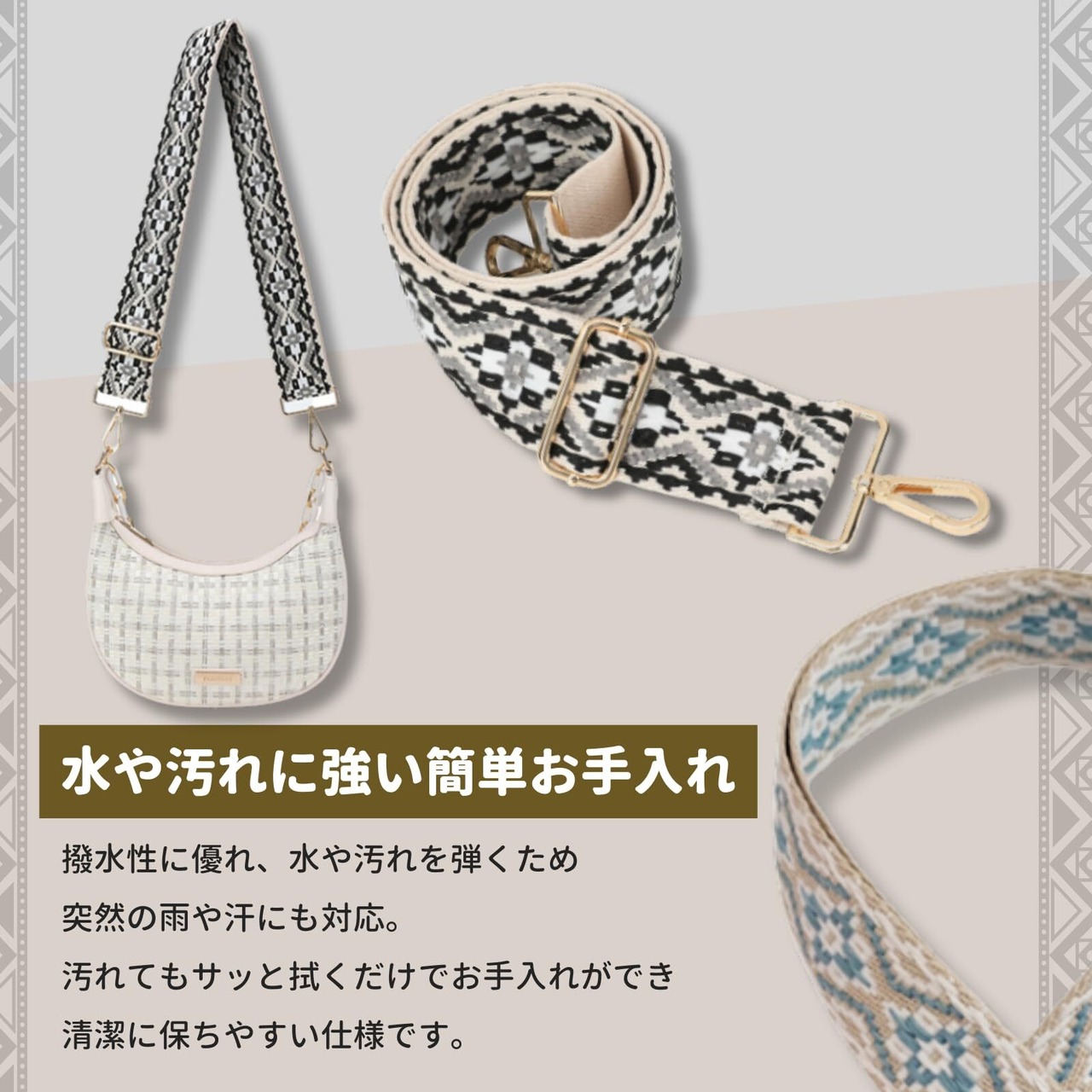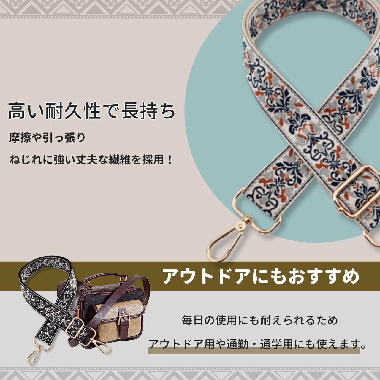 【付け替え用ショルダーストラップ】 バッグの利便性を高めるだけでなく、ファッションのアクセントとしても活躍。スタイルに合わせて気軽に付け替えができるアイテムです。 【軽量で快適な使い心地】 非常に軽い素材を使用しており、肩への負担を軽減。長時間の使用でも疲れにくく、カメラバッグなど重いアイテムとの相性も抜群です。 【高い耐久性で長持ち】 摩擦や引っ張り、ねじれに強い丈夫な繊維を採用。毎日の使用にも耐えられるため、アウトドア用や通勤・通学用にも安心して使えます。 【水や汚れに強い簡単お手入れ】 撥水性に優れ、水や汚れを弾くため、突然の雨や汗にも対応。汚れてもサッと拭くだけでお手入れができ、清潔に保ちやすい仕様です。 【商品詳細】 素材:ポリエステル コットン サイズ:全長 約72~130cm(調整可) / 幅 3.8cm
