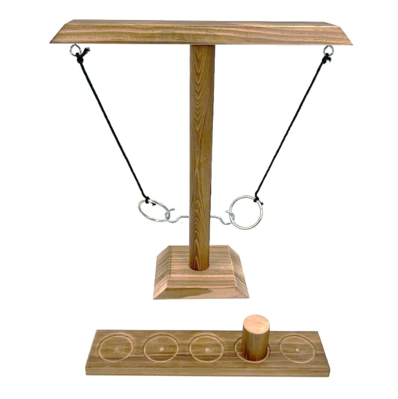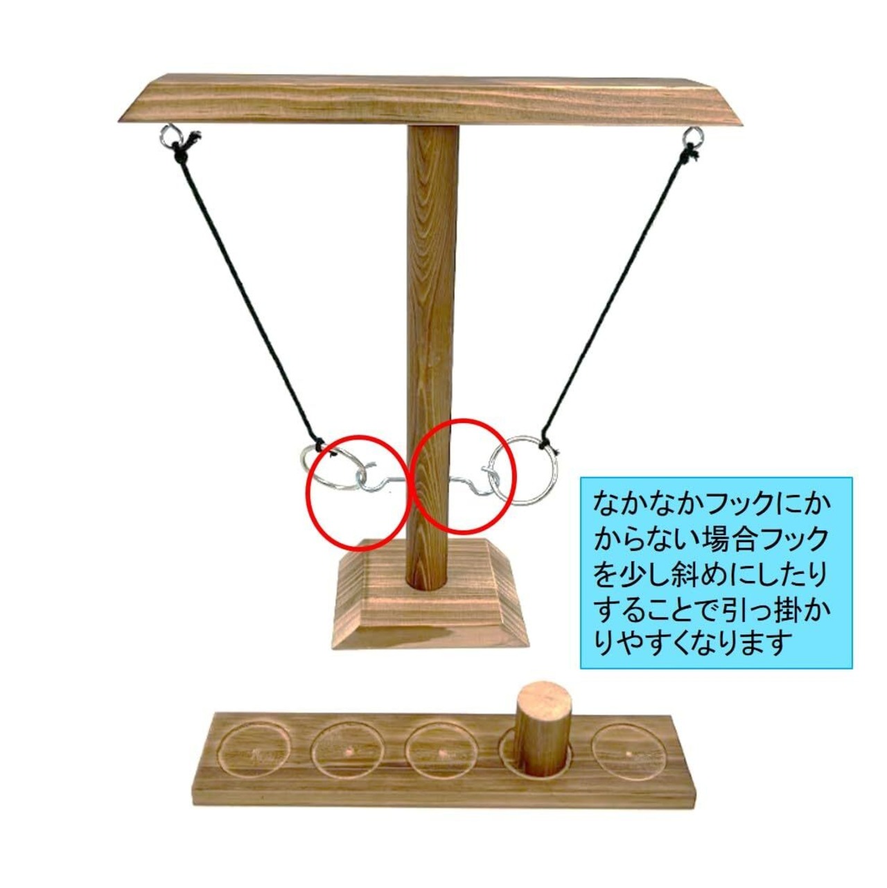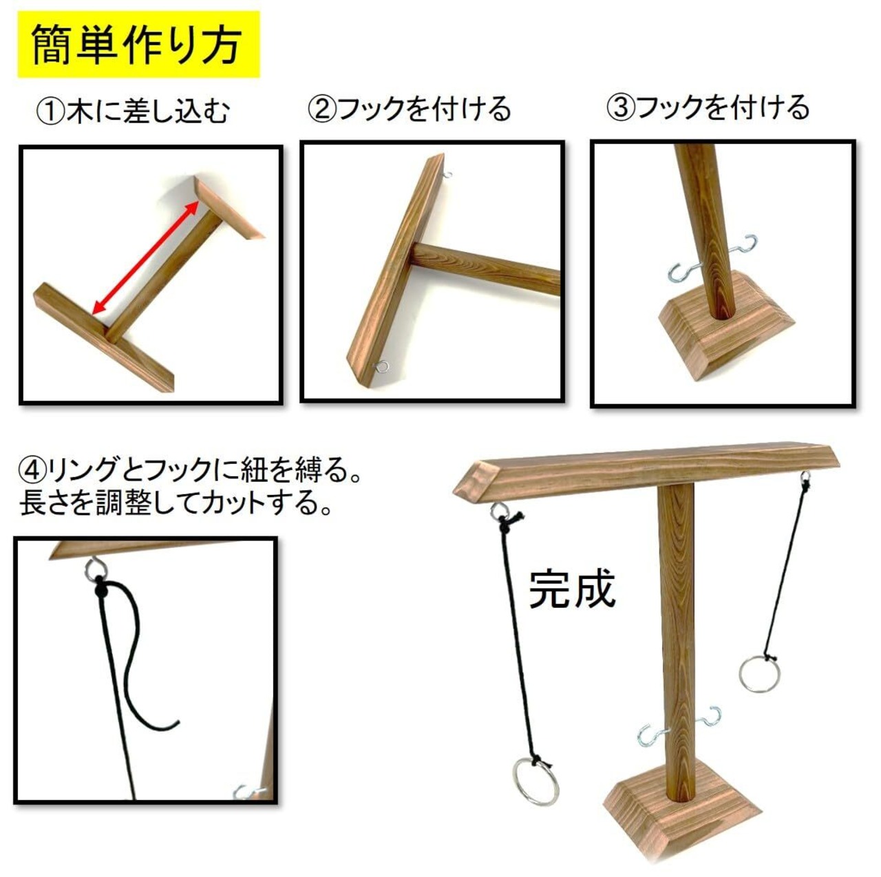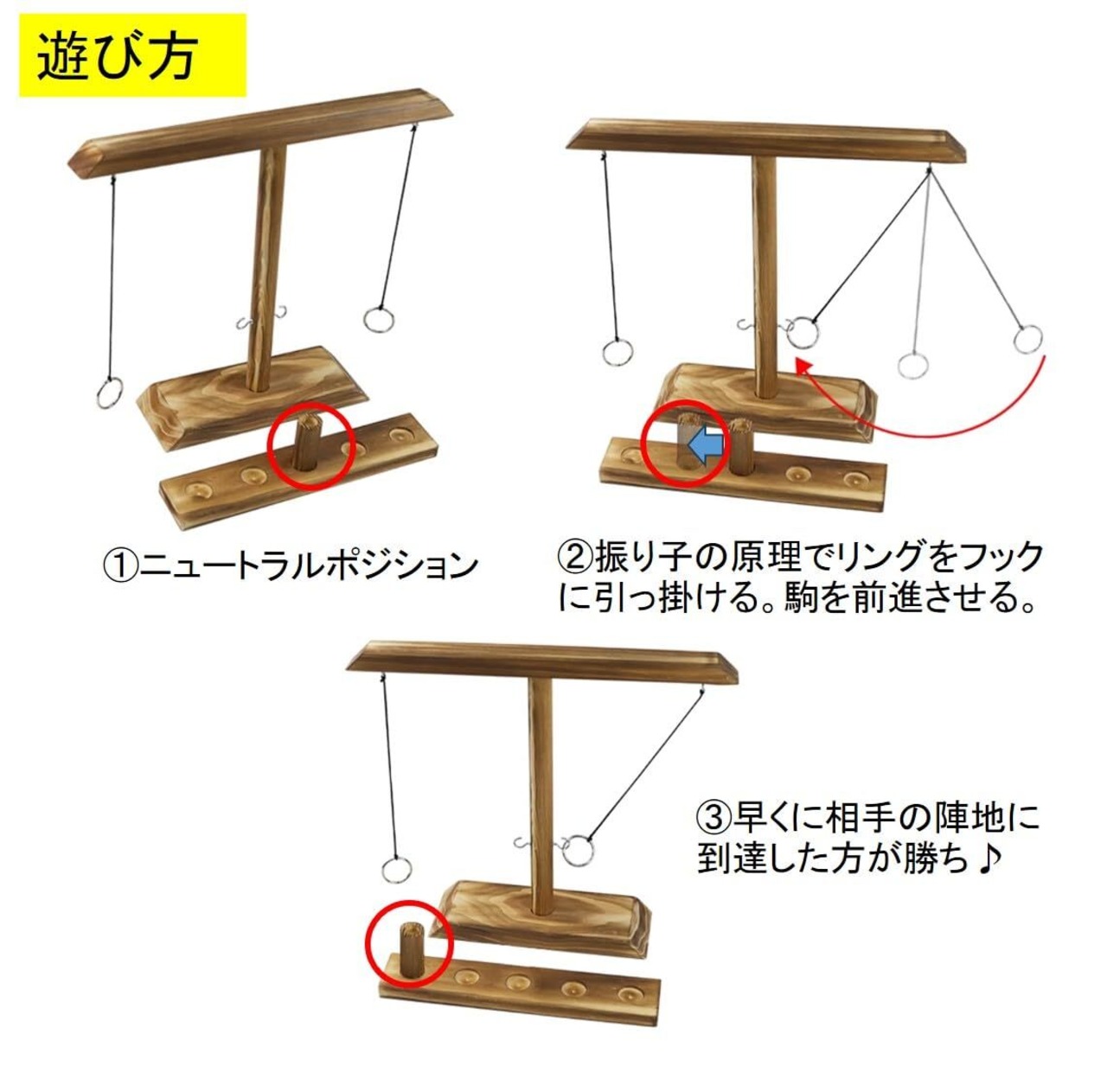 【リングトスゲーム 遊び方】ロープに吊るされたリングを振り子の原理でスイングさせて柱のフックにひっかける。早く相手の陣地に駒を進めた方が勝ちとなります。多人数で遊べて正月などの家族が集まる余興や盛り上げグッズとして楽しめます