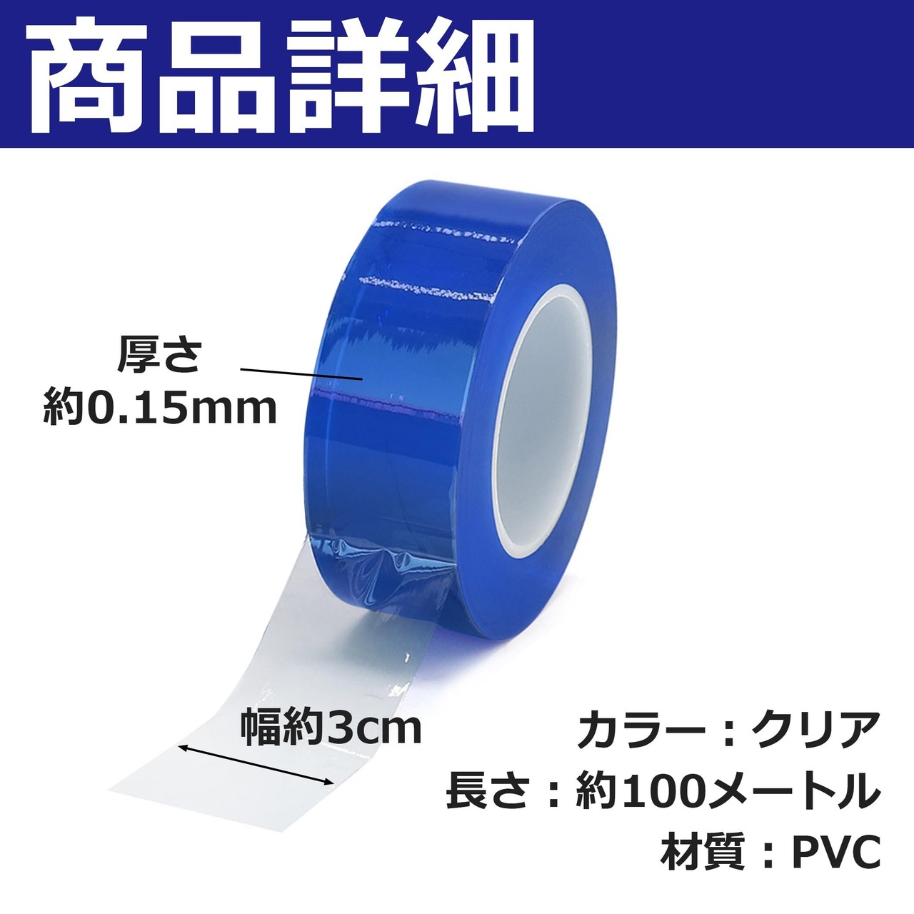 カラー:クリア サイズ:厚さ約0.15mm×幅約3cm 長さ:約100メートル 材質:PVC ※モニターの環境等により色の見え方に若干差が生じる場合がございます。