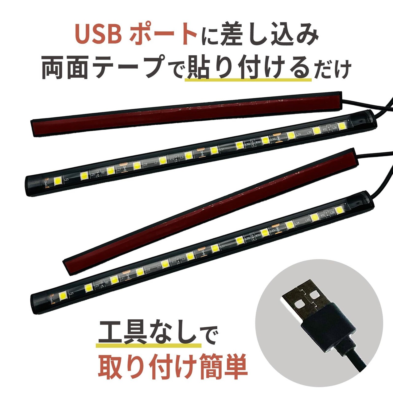 【簡単取付のカー用品アクセサリー】このLED車内ライトはUSB給電なので、ケーブルをシガーソケットのUSBポートに差し込み、あとは貼り付けるだけで様々な車種にて手軽で簡単に使用することができる車用品です。専門的な知識や工具が必要ないので、初めての方でも安心して取り付けできます。4本のテープライトは、約130cmが2本、約180cmが2本の配線なので、車両の運転席・助手席と後部座席などいろいろな場所に設置しやすくなっています。足元やダッシュボード、ドアパネル、ドアパネルなど多様な箇所でお好みに合わせて使用してください。車内用のイルミネーションとしてだけでなく、ルームランプやフットランプとして夜間の暗いところの視認性が上がり、安全面の効果もあります。