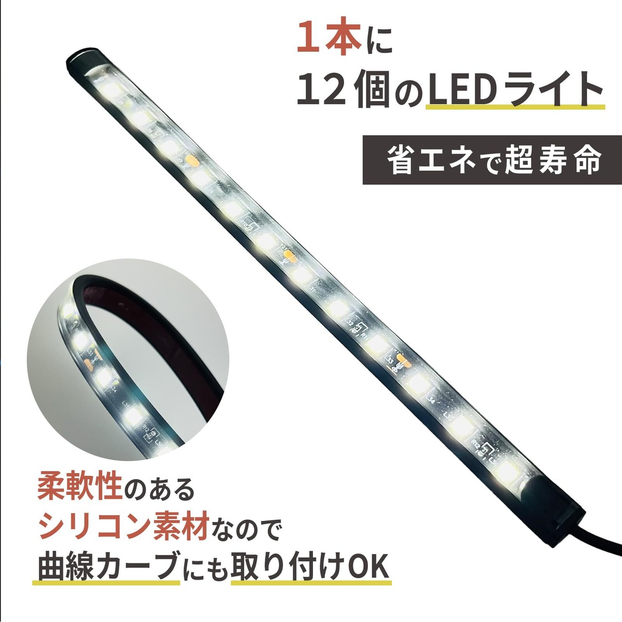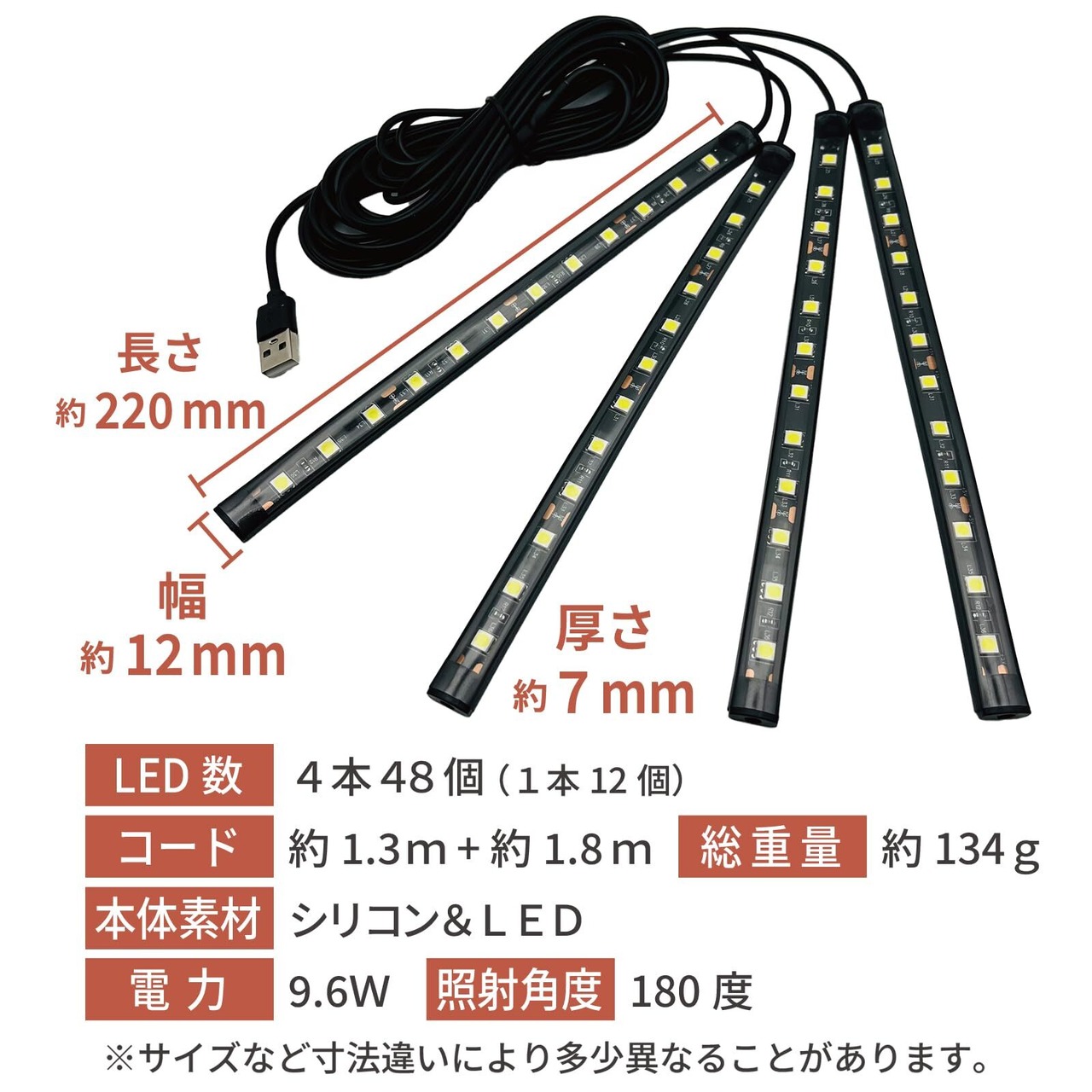 【商品仕様】LEDライト:長さ 約220mm×幅 約12mm×厚さ 約7mm。LED数:1本12個(4本48個)。コード:約1.3m*2+約1.8m*2。コード含む重量:約134g。本体素材:シリコン&LED。電力:9.6w。照射角度:180度。USB給電。カラー種類:ホワイト。ブルー。アイスブルー。グリーン。レッド。イエローオレンジ。ピンクパープル。同封内容:本体(USBケーブル含む)。※サイズなど採寸方法の違いにより多少異なることがあります