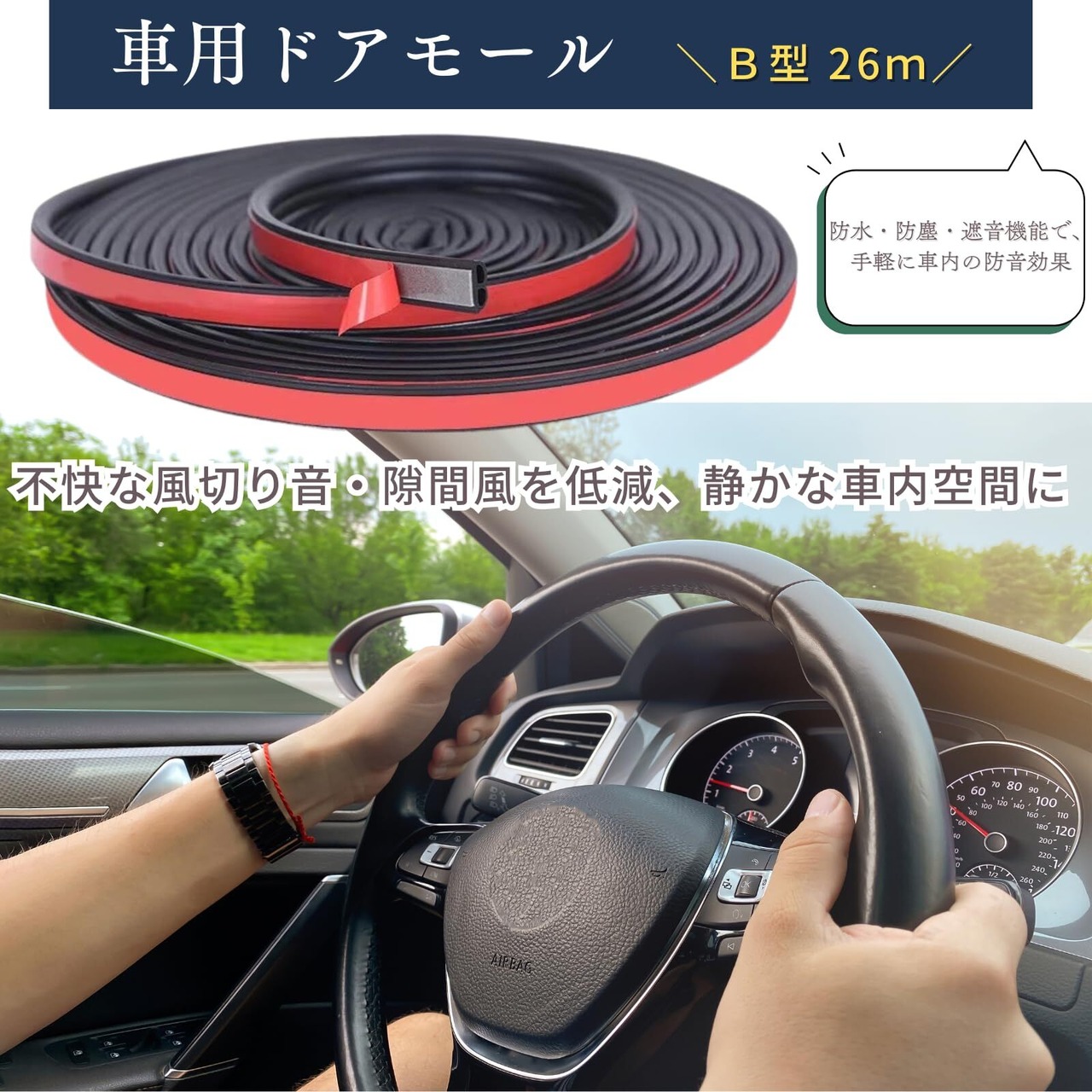 【車用ドアモール B型 26m】不快な風切り音・隙間風を低減、静かな車内空間に。防水・防塵・遮音機能があり、手軽に車内の防音効果を改善したい方におすすめです。