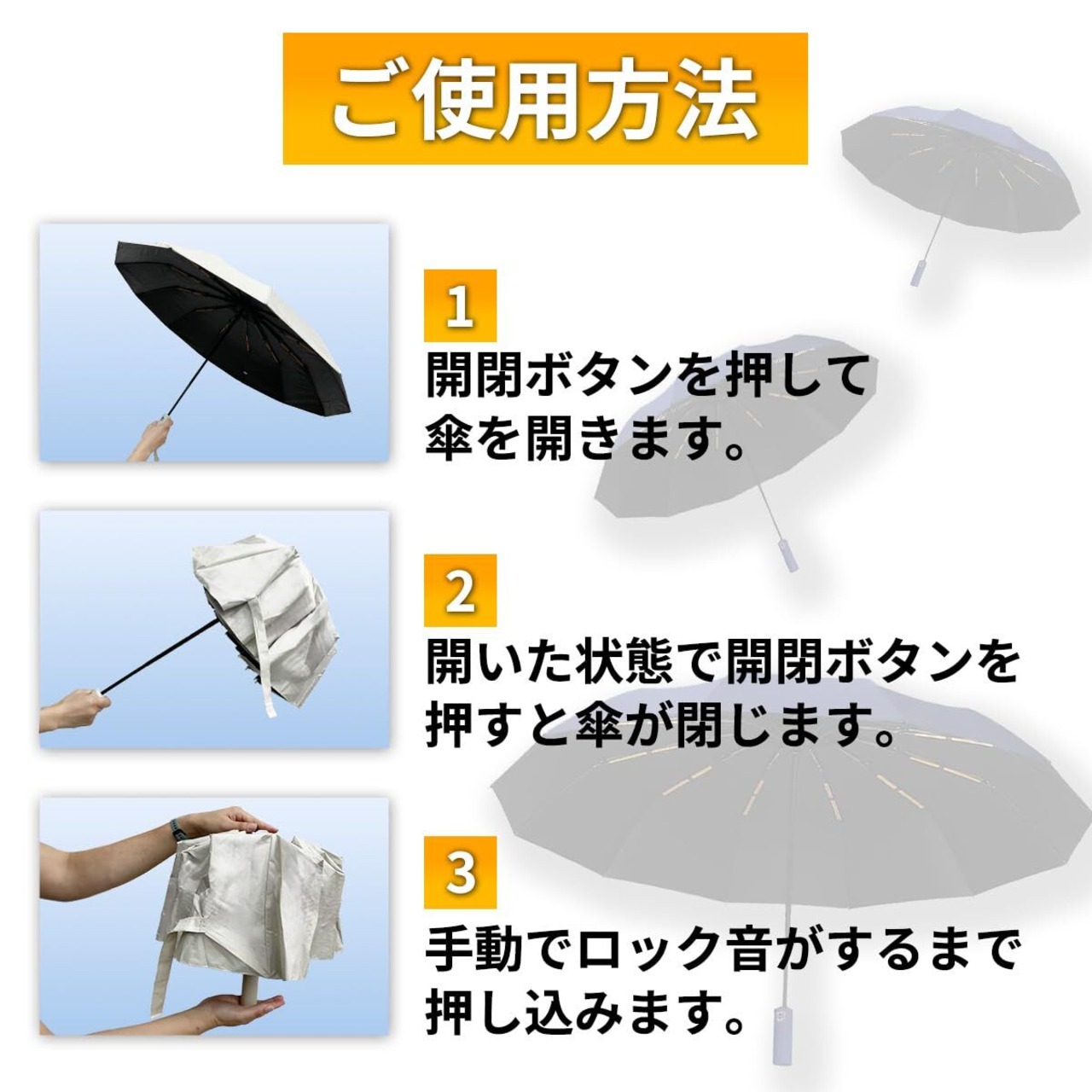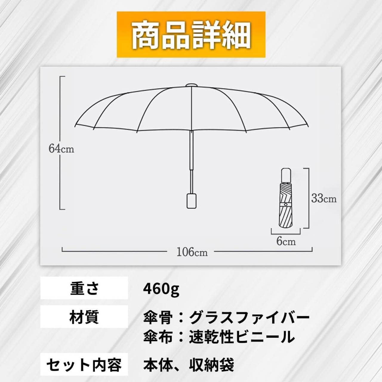 折りたたみ傘 24本骨(12か所×2本) 1. 晴雨兼用 2. 100cmを越えるビッグサイズ 3.開くだけでマイナス13℃ 紫外線を強力にカットし、高い遮熱効果を発揮します UPF:50+ UVカット:99%以上 体感温度:マイナス6〜13℃ 4. 耐久性・耐風性に優れた12本骨 5. 自動開閉 ボタンをプッシュするだけで傘が開きます 6.細部へのこだわり 水濡れキャップ、便利なマジックテープ、安全のつゆさき、ひも付きの持ち手を採用しております 商品名:折りたたみ傘 メンズ 自動開閉 晴雨兼用 大きい 晴雨兼用傘 レディース 丈夫 頑丈 uv ワンタッチ uvカット おしゃれ 風に強い 強風 遮熱 遮光 最強 二つ折り 撥水 持ち手 リュック 折りたたみ傘 折り畳み傘 雨傘 日傘 雨晴兼用 雨 雨用 24本 12本 風に強い 関連ワード:リュック ゴルフ ノーブランド ギフト 大 大きいサイズ 大きめ 大型 収納 安い 6本骨 8本骨 10本骨 24本骨