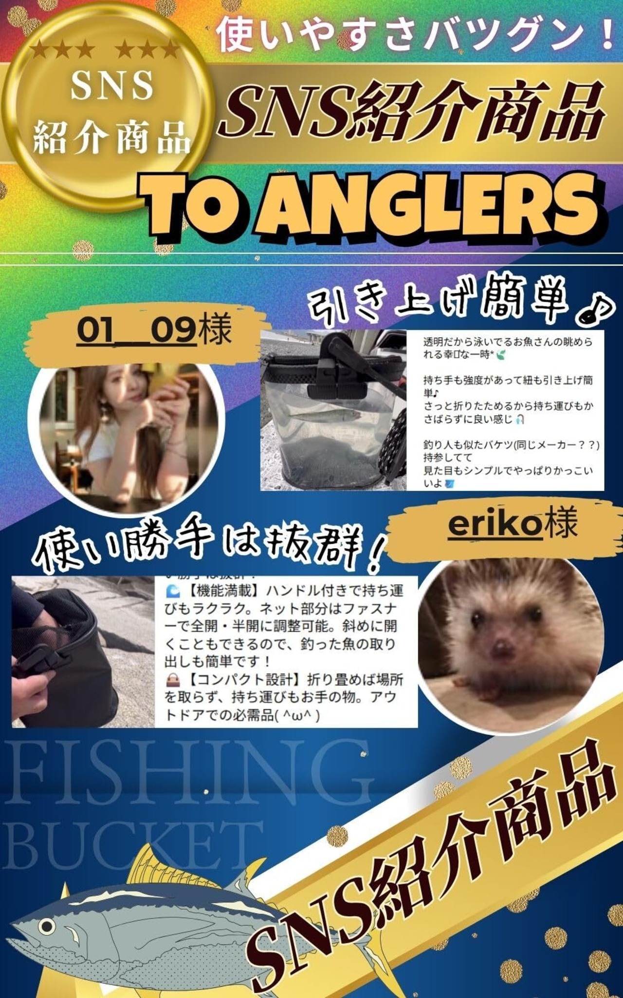 活かし用にピッタリな折畳み釣りバケツと魚掴みのセットです。作りやロープがしっかりし水汲みが楽で使い勝手が良い魚釣りグッズです。釣りバッカンは、持ち手のハンドルが付いており、ネット部分のファスナーも用途に応じ全開/半開と調整でき斜めに開くことも出来ます。折りたたみで場所を取らず持運びしやすい魚釣りバケツです。