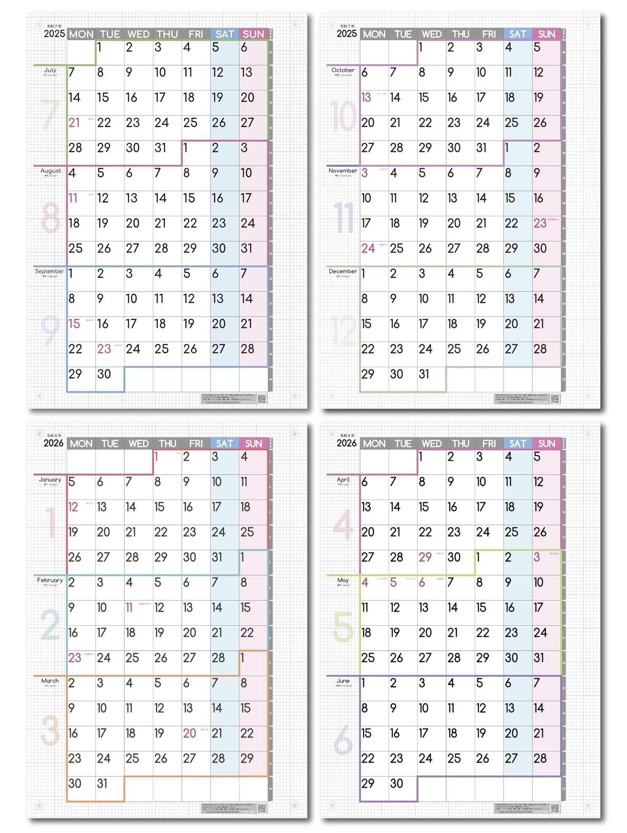 各月の境目は色違いの太線で区切ってあるのでわかりやすい。