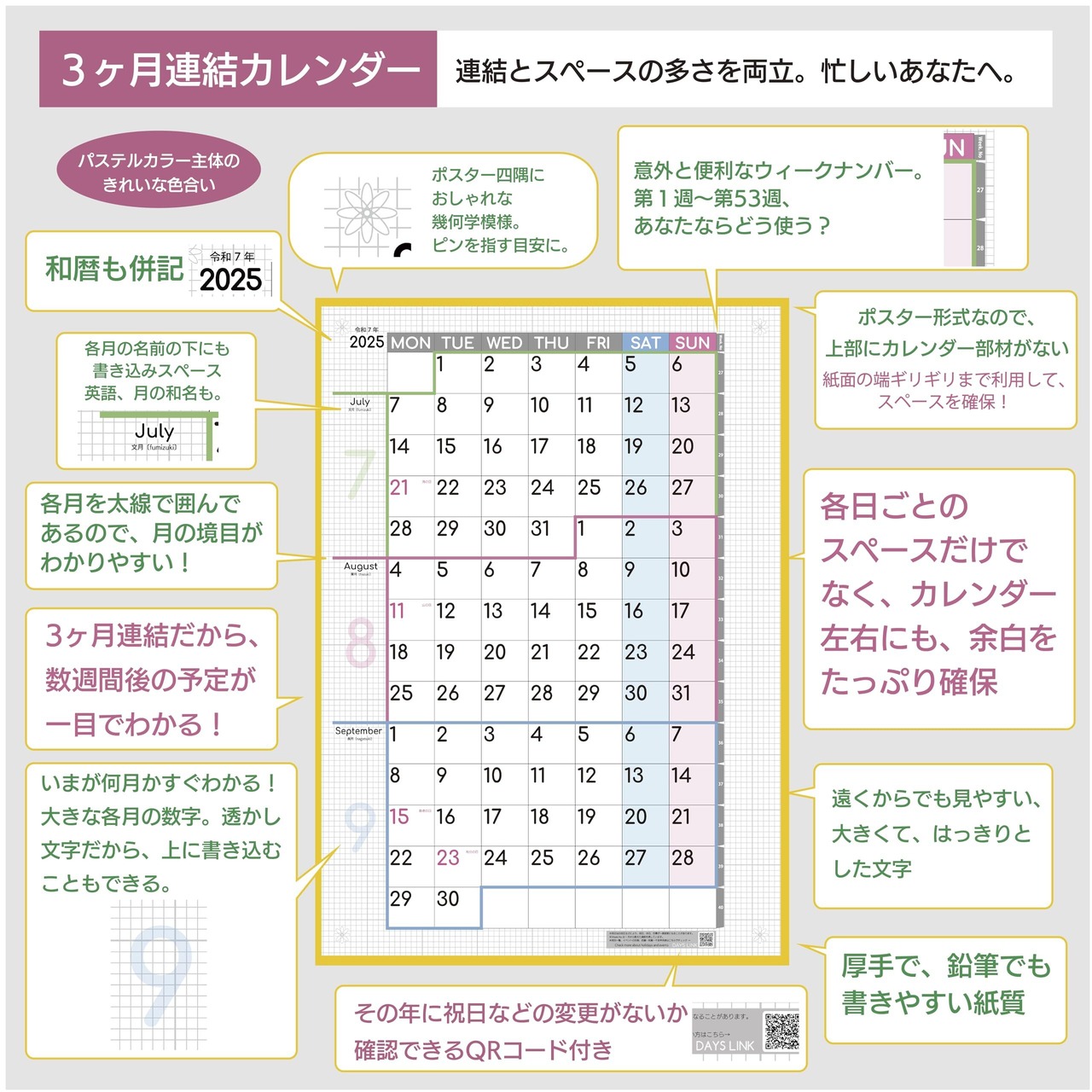 DAYS LINK 3ヶ月連結カレンダー ポスター 2025年 7月始まり 月曜始まり 大きい 壁掛け A2