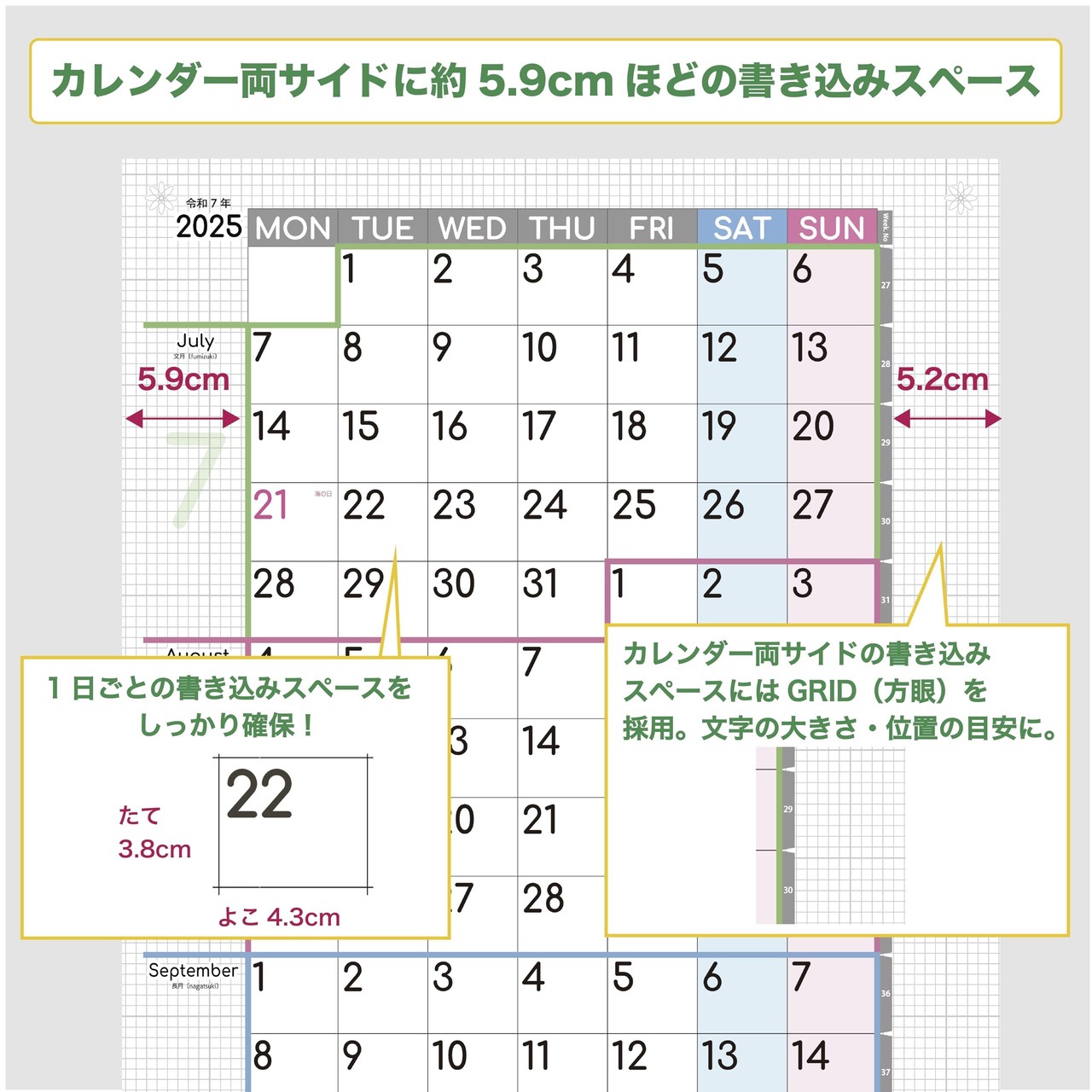 1日ごとのスペースはもちろん、カレンダー両脇に書き込み自由なフリースペースを確保。各月は数字だけでなく、英語、月の和名も掲載。また、月の数字の下にもフリースペースを確保。書き込みスペースには、方眼を採用。文字の大きさや位置の目安に。