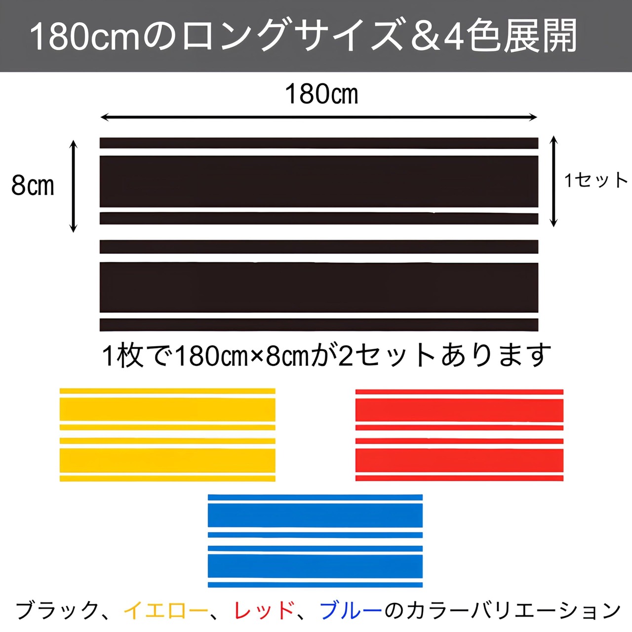 【180cmのロングサイズ&4色展開】選べる4カラー × たっぷり180cmのロングサイズ。ブラック・レッド・ブルー・イエローの4色展開。180cm × 8cm の大判サイズで、カットして自由に使える。2枚分だから、左右対称に貼ることも可能。どんな車にもフィットするサイズ感で、自由なカスタムを楽しめます。