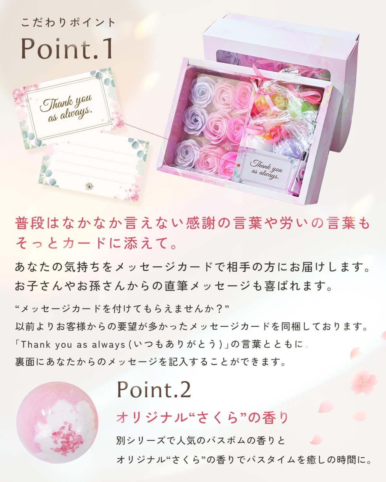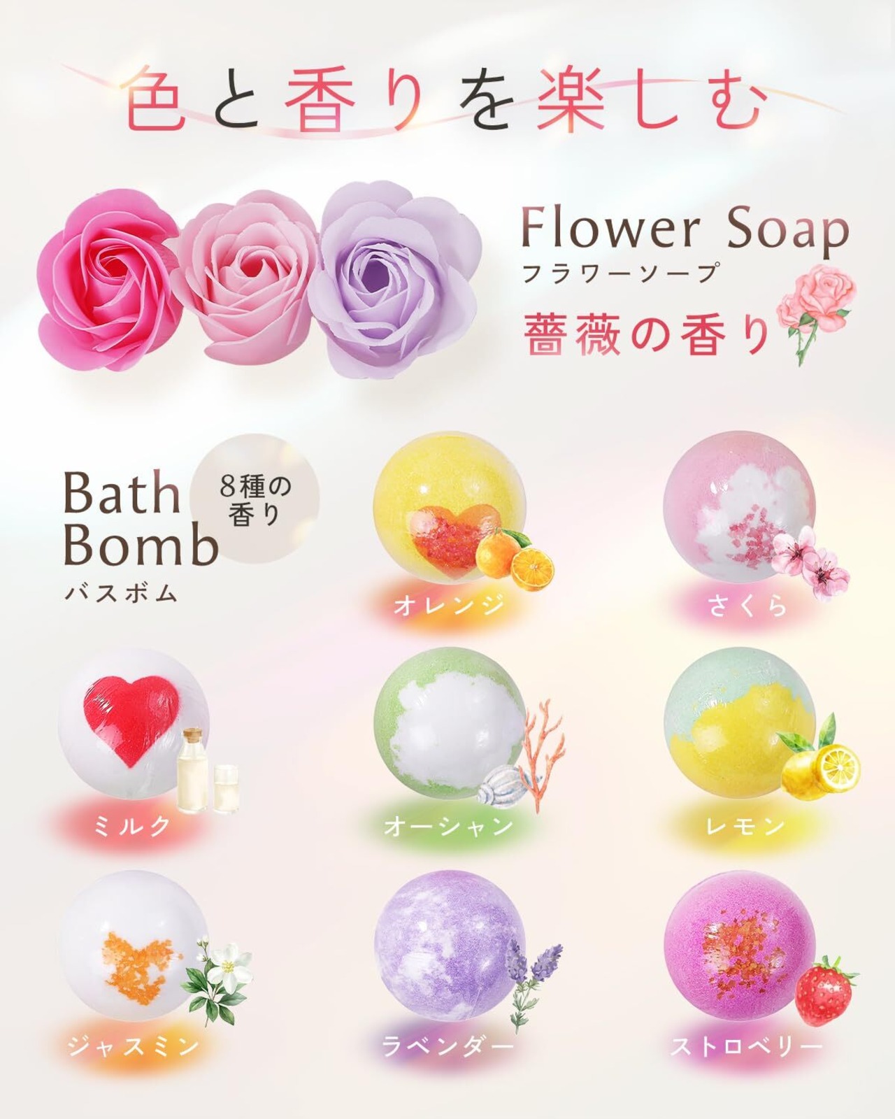 【大切な人へ、“ありがとう”をカタチに。】香りと彩りで癒す、贅沢バスタイムギフト 開けた瞬間、思わず笑顔になる—— まるで花束のように詰まったフラワーソープと、シュワっと弾ける8種の香り付きバスボム。 心と体をふわっと解きほぐす、極上のバスタイムギフトセットです。 バスボムは1個ずつ個包装&開けやすい専用オープナー付き。 ソープフラワーはお湯に浮かべたり、シャワーで泡立てて泡風呂にも◎。 贅沢だけど気取らない、あたたかい“ありがとう”が伝わるギフトに仕上げました。 【こだわりの内容と品質】 フラワーソープ(9輪):ピンク・ライトピンク・ライトパープル 各3個(バラの香り) バスボム(8種):オレンジ/さくら/ミルク/オーシャン/レモン/ジャスミン/ラベンダー/ストロベリー(各1個・約60g) メッセージカード付き:「Thank you as always」の文字入りでそのまま渡しても◎ 裏面には手書きもOK バスボム専用オープナー付き:ネイルを気にせず安心して開封できます パッケージサイズ:横24㎝ × 奥行18㎝ × 高さ10㎝/重量:約750g 【プレゼントに選ばれる理由】 見た目の華やかさ × 実用性 花束のようなソープフラワーは、見て嬉しい・使って楽しい! 飾って楽しめるインテリアとしても◎ 香りが選べる8種のバスボム 気分や好みに合わせて香りをセレクト。毎日のバスタイムがちょっと特別なものに。 メッセージカード付きで心が伝わる カジュアルにもフォーマルにも対応できる、ちょうどいい想いの伝え方。 (メッセージを記入する場合は箱を開封しメッセージカードに想いを記入して下さい。) クリア台座で配送時も安心 揺れによる破損を防ぐ、配送対策済パッケージ。贈り物としても安心してお渡しいただけます。 ラッピング不要の高見えBOX入り ピンクベースの可愛らしいデザインパッケージで、そのまま渡せるのが嬉しい! 【贈る相手もシーンも選ばない】 誕生日、母の日、父の日、敬老の日、送別会、記念日、バレンタイン、ホワイトデー、クリスマス、お返しや内祝いにも。 女性・男性・彼女・奥様・お母さん・女友達・同僚・先生・子どもまで、幅広い世代に選ばれる王道ギフトです。 【こんな方にぴったり!】 ギフトに何を選んだらいいか迷っている プレゼントに“気持ち”も一緒に伝えたい 可愛さも実用性もある贈り物を探している 女性ウケする高見えプチギフトを探している 自分へのご褒美に癒し時間がほしい