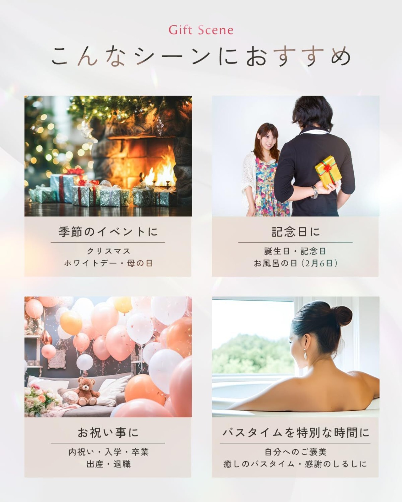 【贈る相手もシーンも選ばない】 誕生日、母の日、父の日、敬老の日、送別会、記念日、バレンタイン、ホワイトデー、クリスマス、お返しや内祝いにも。 女性・男性・彼女・奥様・お母さん・女友達・同僚・先生・子どもまで、幅広い世代に選ばれる王道ギフトです。