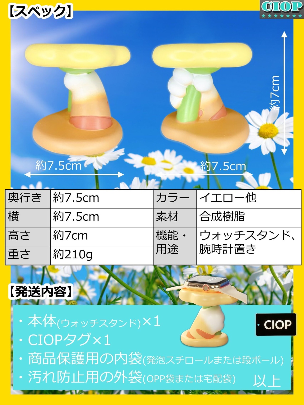 【サイズ】:奥行き7.5cm×7.5cm×高さ7cm 【重さ】:約210g 【材質】:合成樹脂(生産国:中国) 【機能・用途】:ウォッチスタンド、腕時計置き