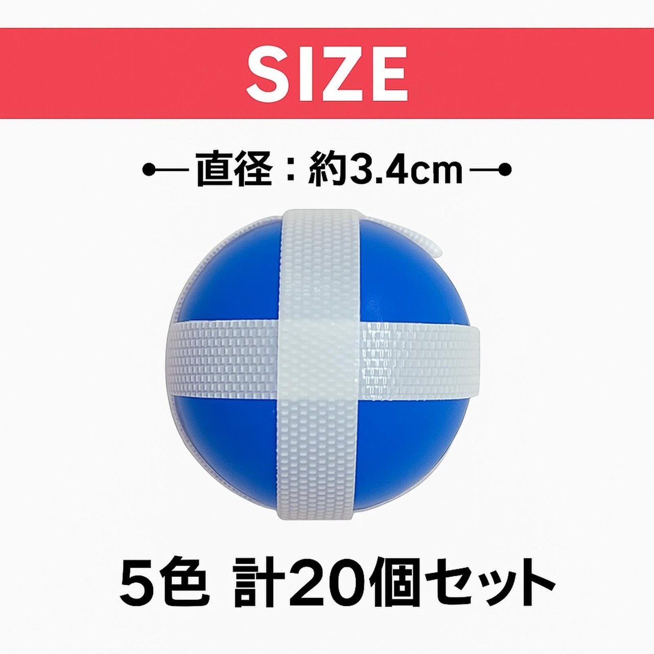 【セット内容とサイズ】カラーボールは5色×各4個の合計20個セット。カラーはブルー、レッド、グリーン、イエロー、マゼンタ。ボールの直径は約3.4cmで、小さな手にも持ちやすいサイズです