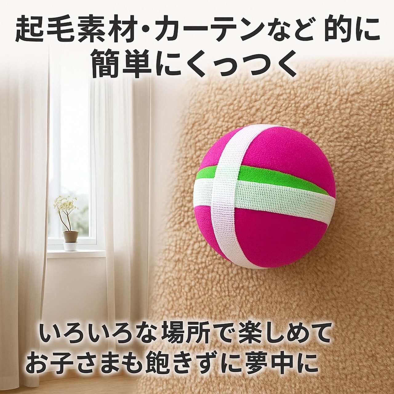 【投げて当てるだけでピタッとくっつく】カラーボールは、ダーツ的や起毛素材の衣類・カーテンなどに投げて当てると簡単にくっつきます。いろいろな場所で楽しめるため、お子さまも飽きずに夢中で遊べます