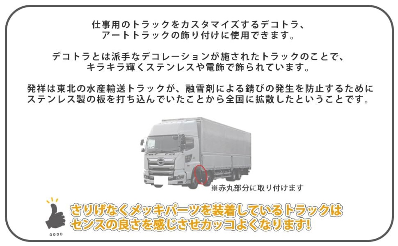 トラック側面は飾りつけで差が出る重要なポイントですので、最初のパーツとして気軽にトラックの飾りつけができるメッキ マッド ガード カバーをお勧めします。※車両により個体差のある場合がありますので、取り付けに加工を要する事があります。