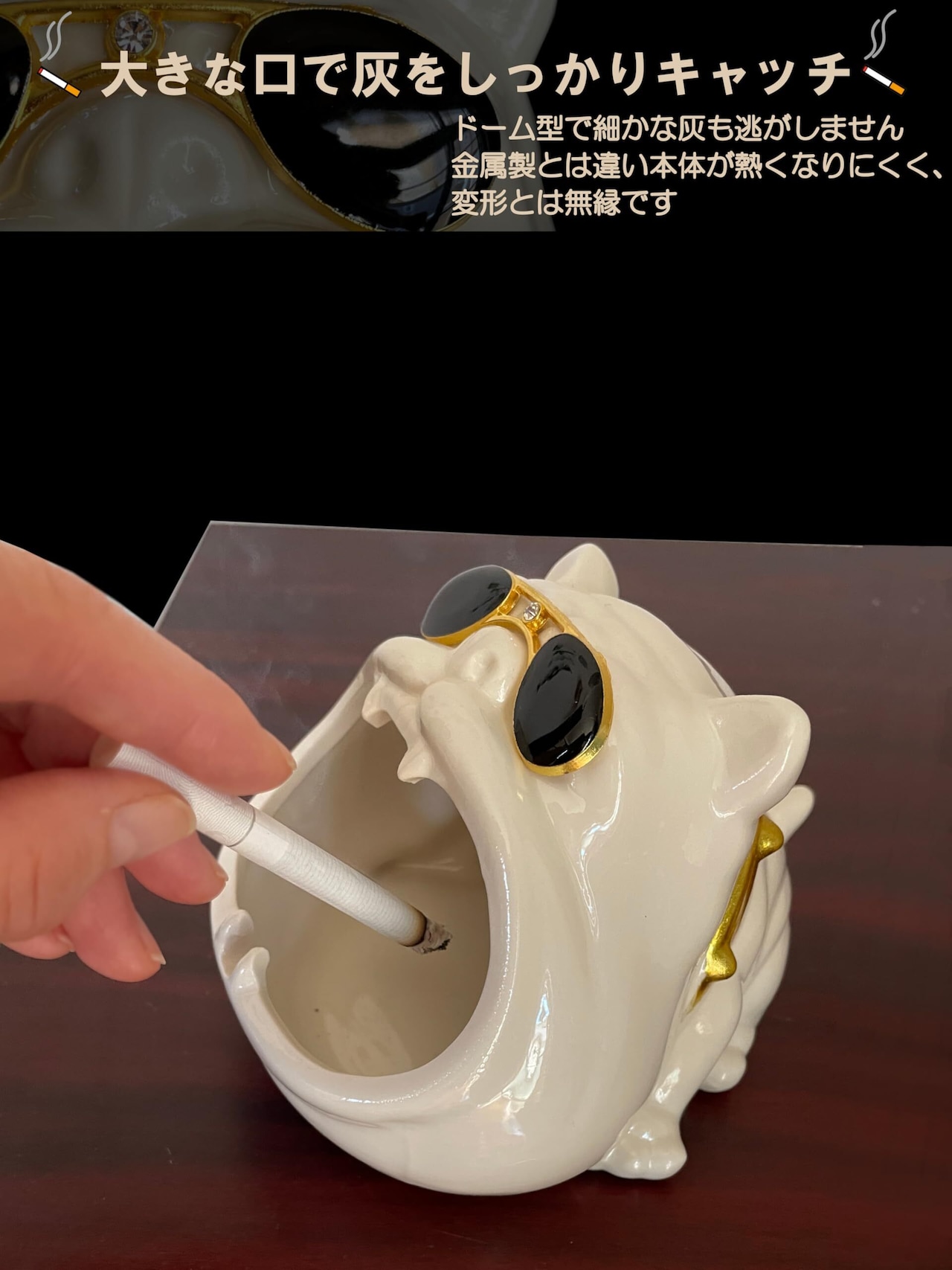 【洗練された白が映える、おしゃれな犬型灰皿】 フレンチブルドッグのユニークな表情と純白の艶やかな質感が目を惹く陶器製灰皿。金色のサングラスがアクセントとなり、クールで上品なデザインに仕上がっています。灰皿としての機能性はもちろん、インテリアとしても抜群の存在感。リビングやデスク周りに置くだけで空間を格上げ。犬好きへのギフトにもおすすめ。 【たっぷり使える大容量。ヘビースモーカーも満足】 大きく開いた口元は、吸い殻を余裕で収納できる設計。頻繁にタバコを吸う方でも快適に使え、片付けの手間も軽減。喫煙時間に集中したい方や来客対応時にも、スマートに灰処理ができて便利。1日に何本も吸う方にも安心の使用感を提供します。 【灰の飛散を防ぐドーム形状で清潔感キープ】 立体感あるドーム型の構造により、灰や煙が周囲に広がりにくく、テーブルの上でも安心。吹き込みによる灰の舞い上がりも防ぎ、清潔な空間を保ちます。スタイリッシュな形状と実用性を両立した設計は、使う人の快適性を重視したこだわりです。 【どっしり安定!安心感ある陶器ボディ】 重量感のあるセラミック素材を使用しているため、ちょっと手が触れても倒れにくく、安定性は抜群。軽量なプラスチックや金属製灰皿では得られない安心感と高級感を両立。底面も広く、しっかり固定できるため、家庭用にもオフィス用にも最適です。 【熱に強く変形しにくい。長く美しく使える逸品】 高温にさらされても本体が熱くなりにくいセラミック素材。プラスチック製品のように変形や変色の心配がなく、長く愛用可能。白色は清潔感があり、灰の汚れもサッと拭き取れるのでメンテナンスも簡単。日常使いにふさわしいタフさと美しさを兼ね備えています。 【犬好きにはたまらない癒しのインテリア】 遊び心のあるフレンチブルドッグの表情とサングラスデザインが、タバコタイムをより楽しく演出。灰皿としてだけでなく、小物入れやインテリアオブジェとしても活躍。愛犬家やペット好きな方へのプレゼントとしても喜ばれ、話題性のあるアイテムです。 【梱包内容】フレンチブルドッグ 灰皿 白 ×1
