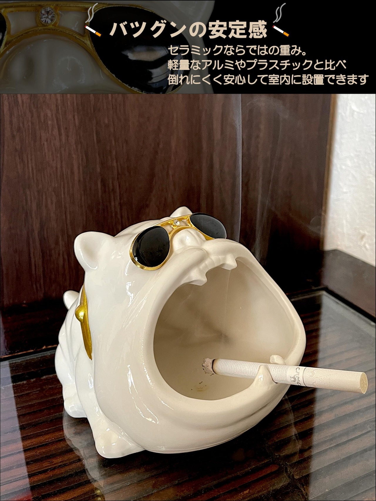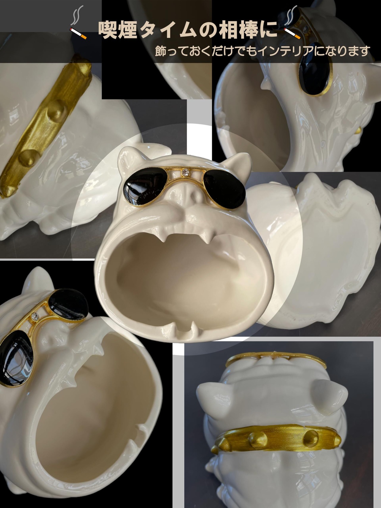 【洗練された白が映える、おしゃれな犬型灰皿】 フレンチブルドッグのユニークな表情と純白の艶やかな質感が目を惹く陶器製灰皿。金色のサングラスがアクセントとなり、クールで上品なデザインに仕上がっています。灰皿としての機能性はもちろん、インテリアとしても抜群の存在感。リビングやデスク周りに置くだけで空間を格上げ。犬好きへのギフトにもおすすめ。