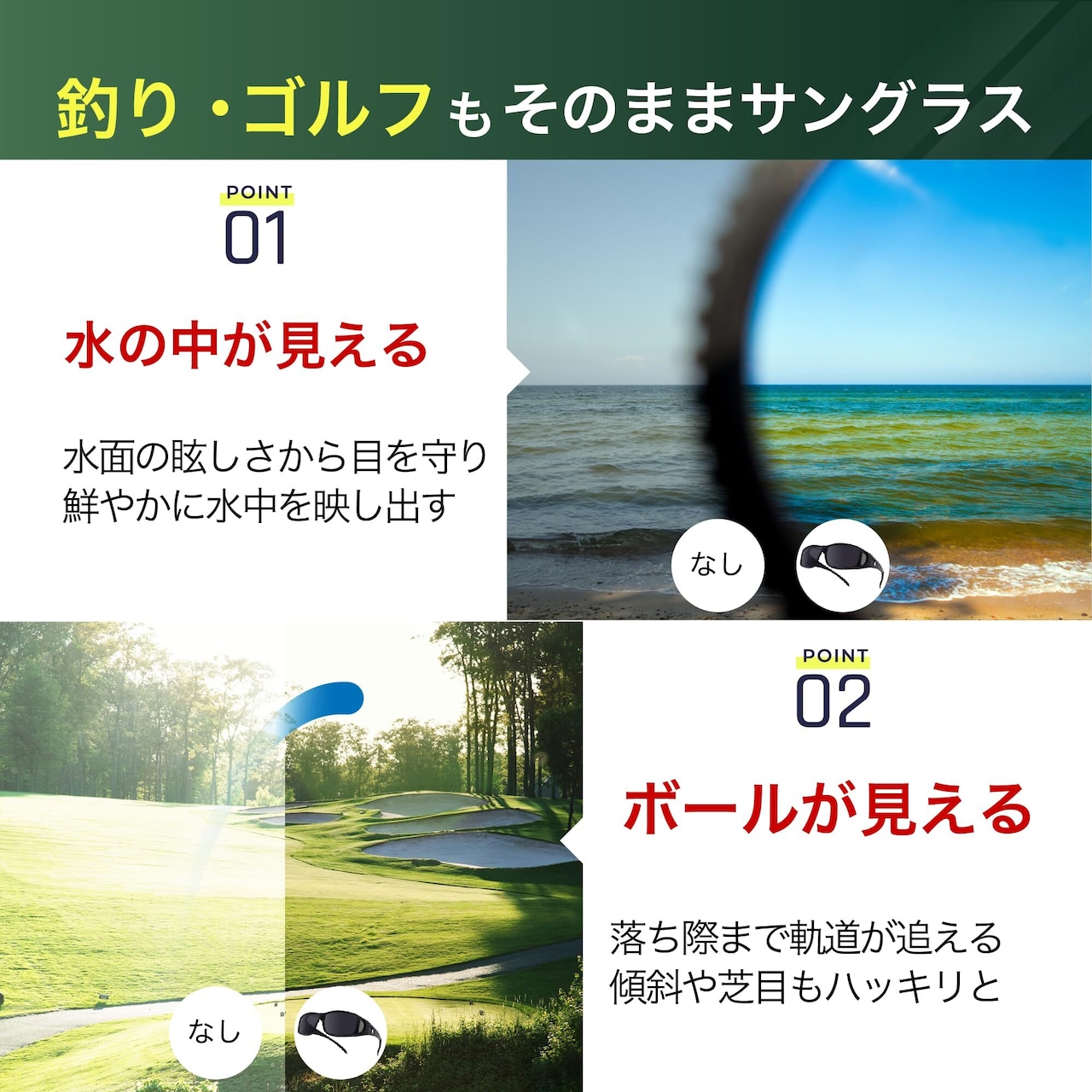 【高機能なHD偏光レンズ】偏光レンズは解像度が高く自然でクリアな視界を確保します。また、UVA・UVB・UVC等の有害光を99%カットするので目の保護にも最適です。