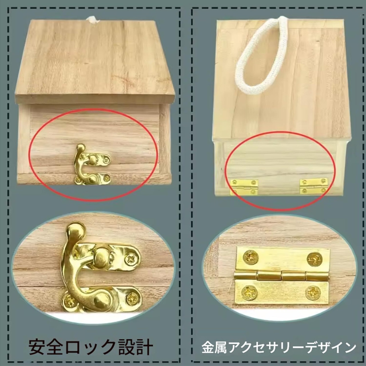 【便利な扉付きでお手入れも簡単】側面にロック付きの扉を備え、中の掃除や点検がスムーズに行えます。鳥の健康を保ちやすく、長く使える実用的なバードハウスです。鳥かごや鳥籠と違い、屋外に設置して野鳥の自然な行動を観察できるのも大きな魅力です。