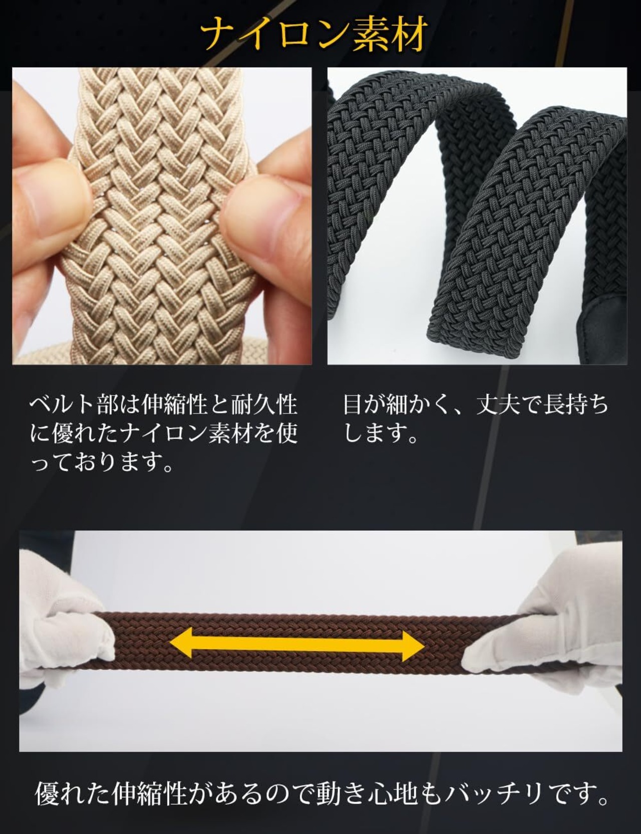 【品質&デザイン】バックルはおしゃれで質感溢れる高品質メッキの合金素材を、ベルト部は伸縮性と耐久性に優れたナイロン素材を使っております。丈夫で長持ちします。