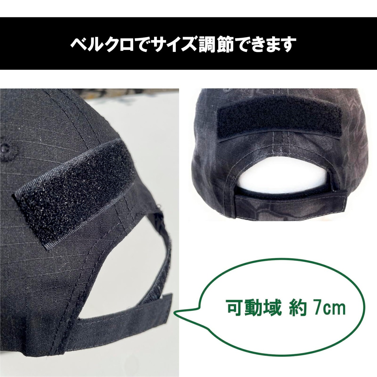 【ベルクロ部分】フロント:約7cm×4.5cm トップ頭頂部:約2cm×2cm バック:約2cm×9cm ワッペンを貼ったりカスタマイズできます