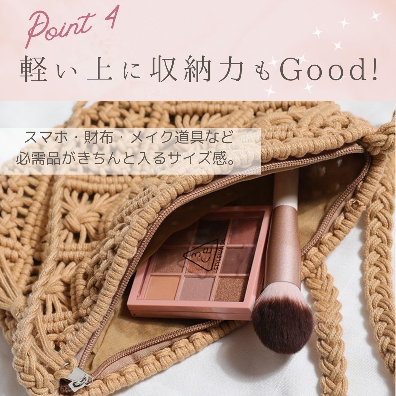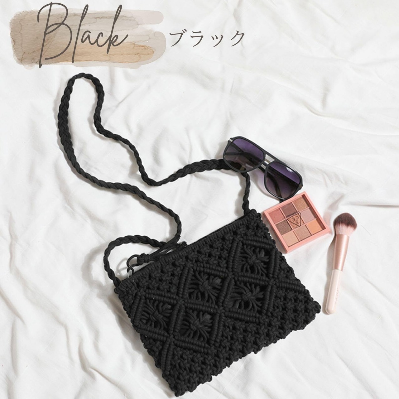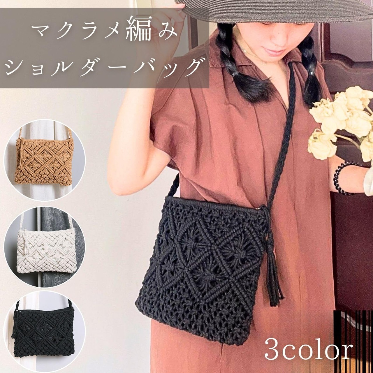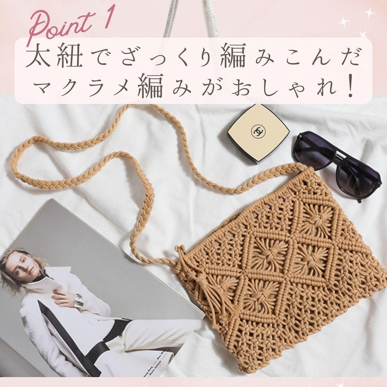 今話題のトレンドアイテム太紐でざっくり編みこんだマクラメ編みがおしゃれなショルダーバッグです。