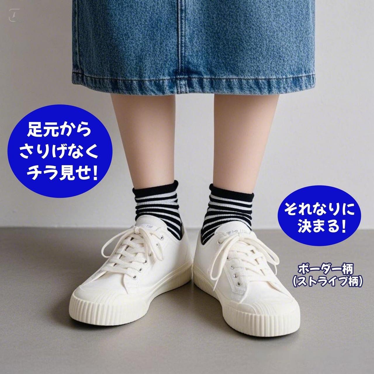 黒と白のストライプ柄のソックスはデザイン違いの2足組なので、その日の気分や服装に合わせて使い分けが出来て◎パンツと靴との間のアクセントに◎チラ見せするだけでさりげなく、おしゃれをアピール!可愛く決まる!