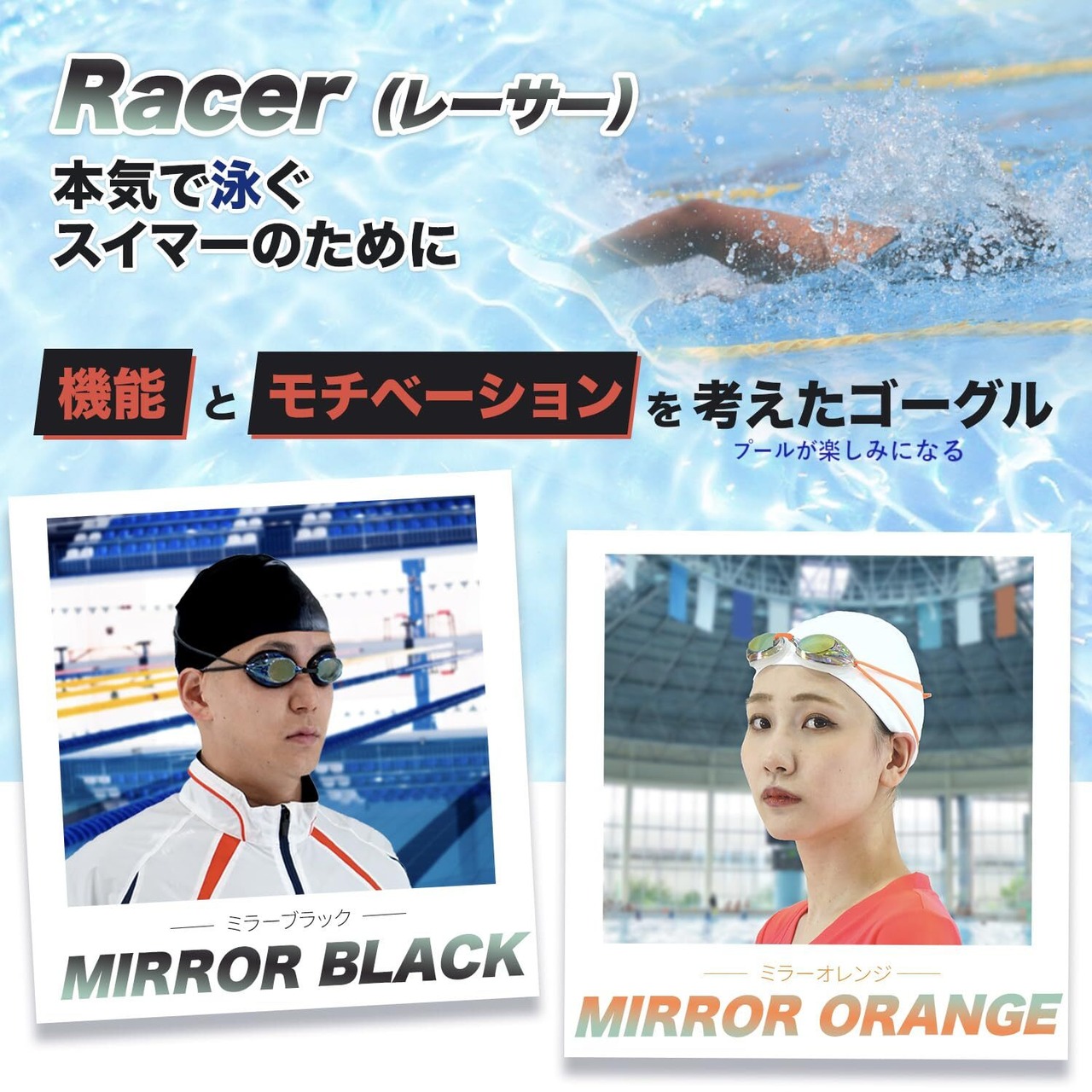 【Racerの商品コンセプト】 スピード感あふれる泳ぎを追求するために設計されたRacer。密着してズレないクッション、3サイズのノーズベルト、ダブルストラップで絶妙なフィット感を実現。小さなレンズが水の抵抗を減らし、視界を限定して集中力を高めます。ミラーレンズでは、周りの視線が気になりません。
