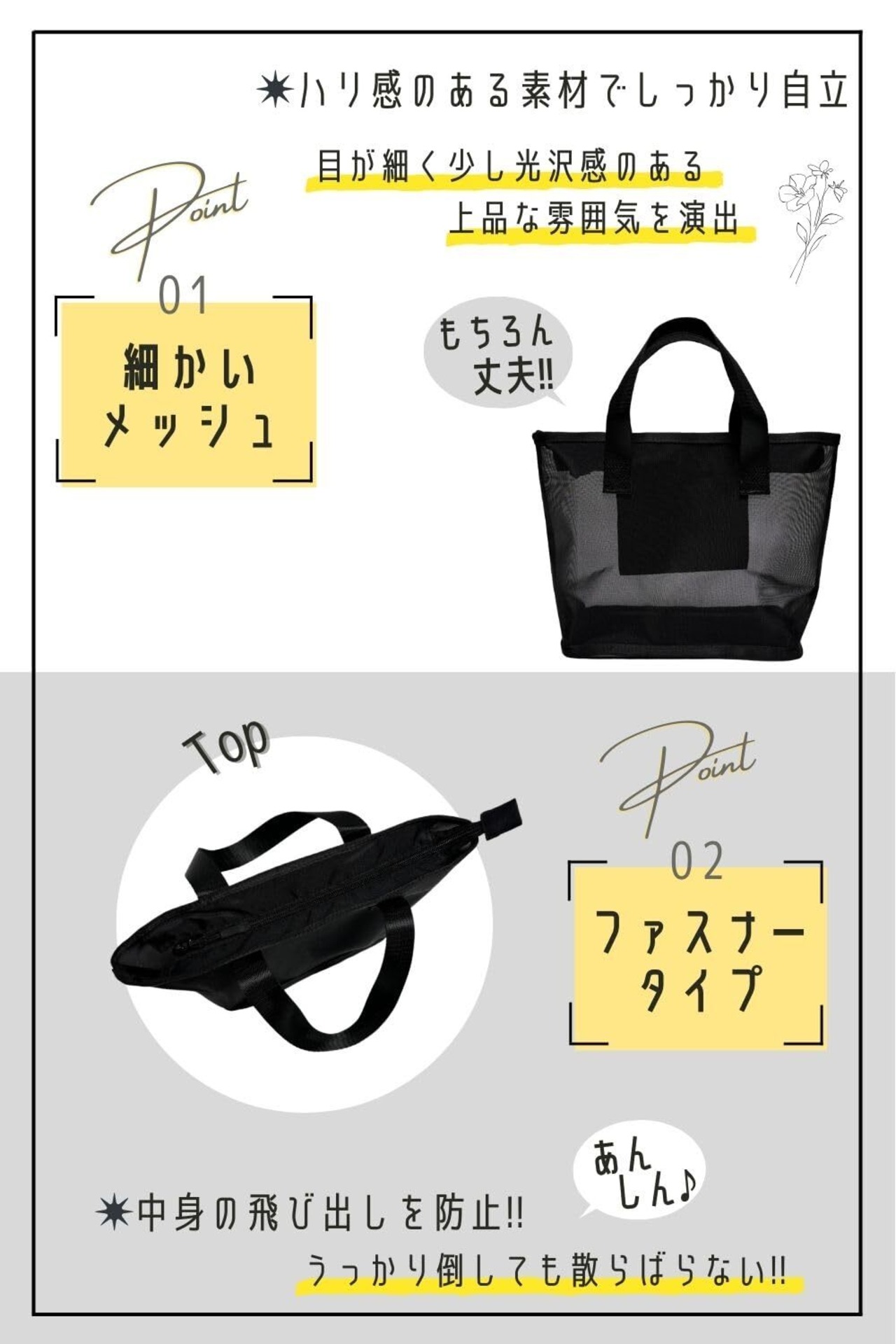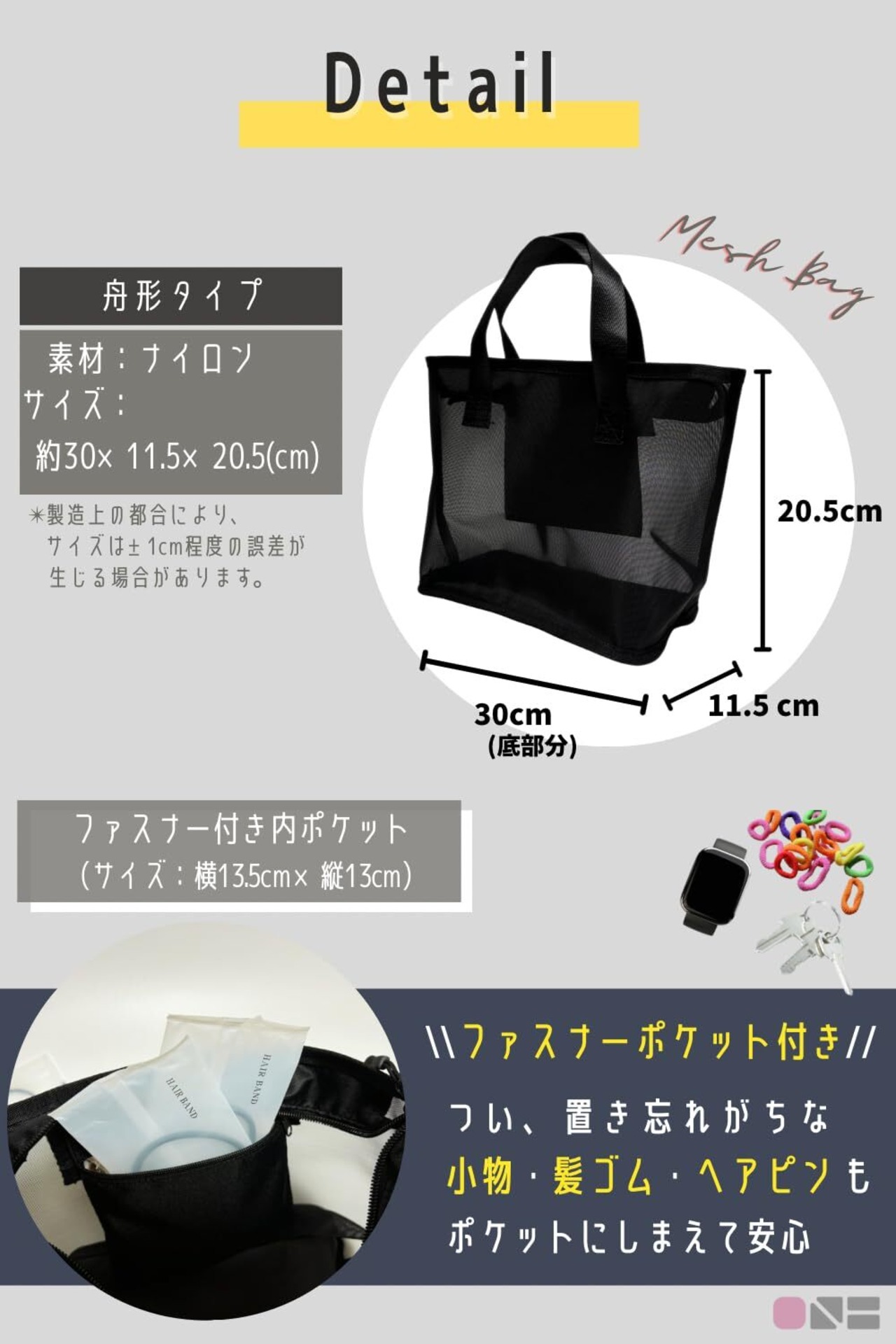 特徴:ファスナー付き内ポケット(横13.5cm×縦13cm)付き!小物や髪ゴム、鍵なども落とさず収納できるので便利また、細かい網目の採用で、 丈夫 かつ 自立 を実現!見た目もオールブラックにリニューアルし更に シンプル で スタイリッシュ に仕上げました✨