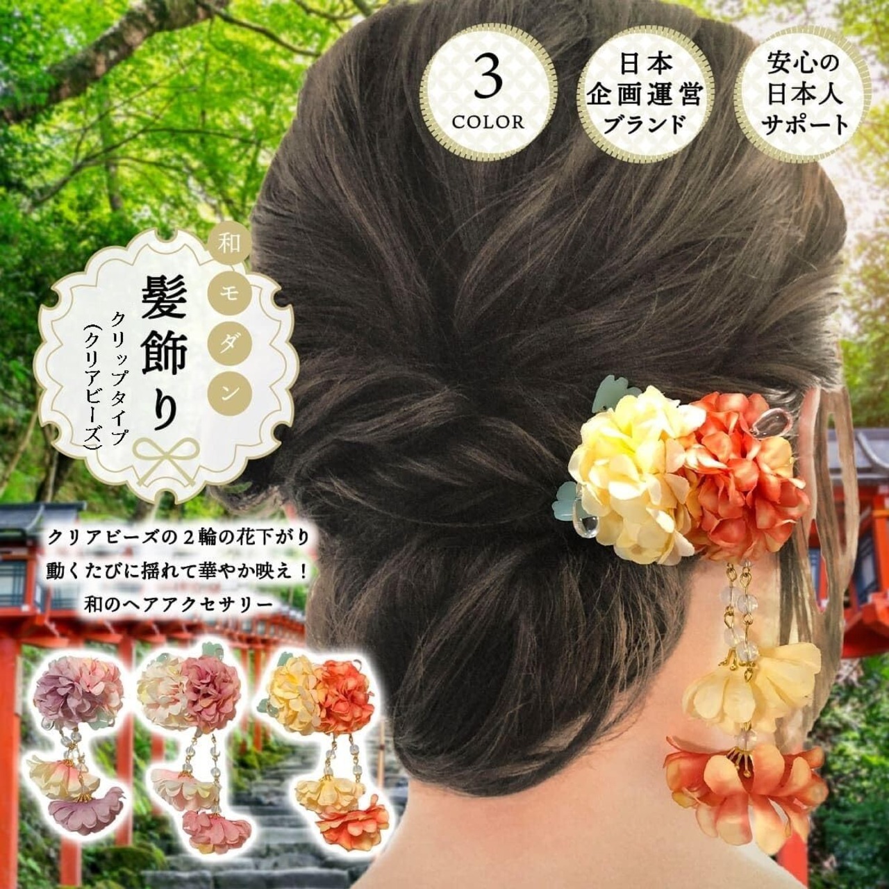 【花下がりが可愛い髪飾り】着物や浴衣のお色に併せたり、お好きな色で楽しんだり、髪飾りを付けてみませんか?小ぶりでさりげなく、花下がりが優しく揺れて上品な可愛さがあります。花下がり部分がパールタイプとクリアビーズタイプがございます。