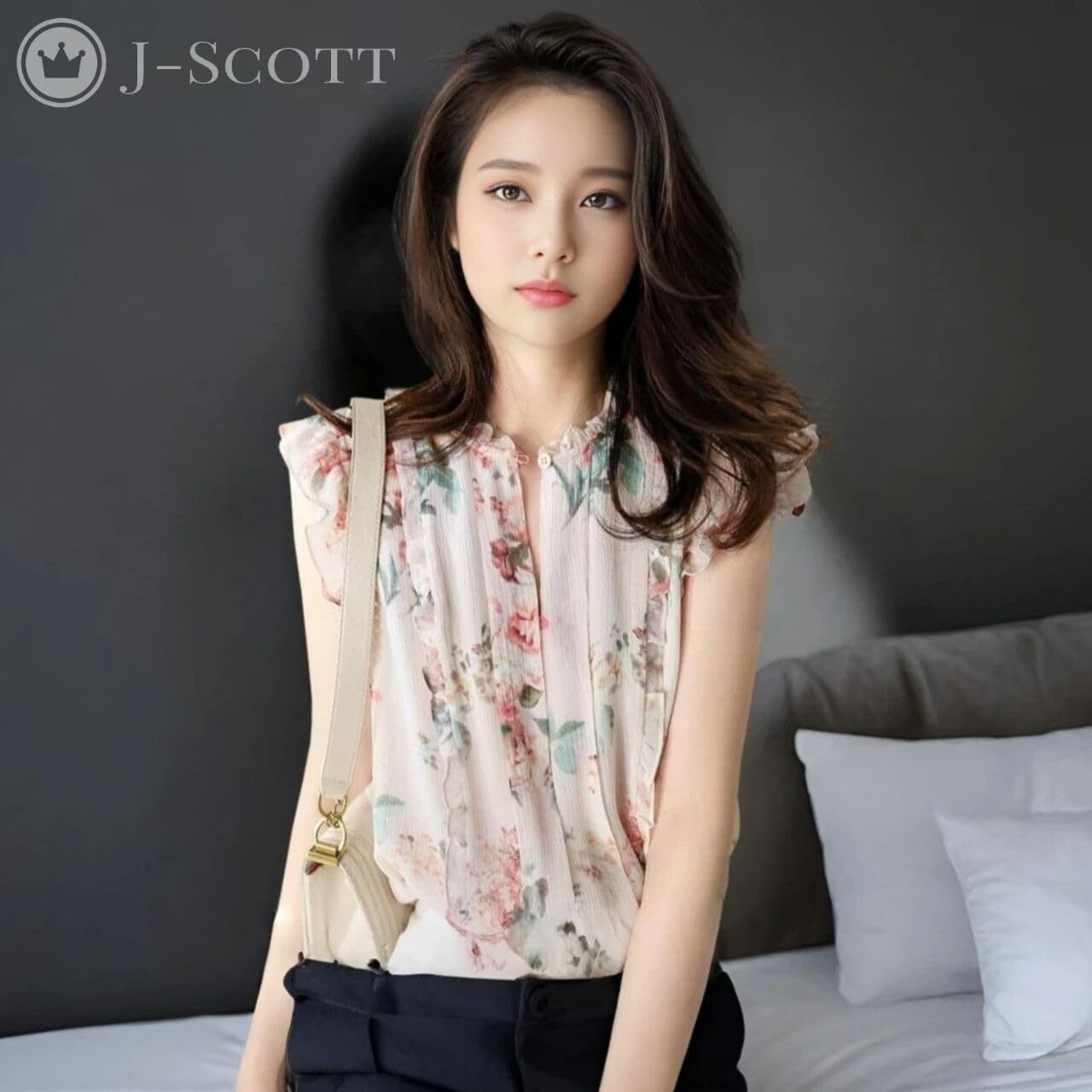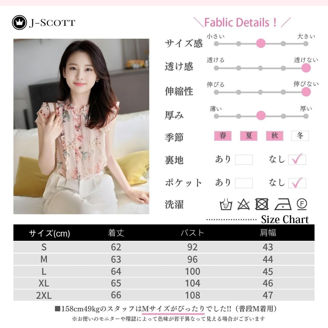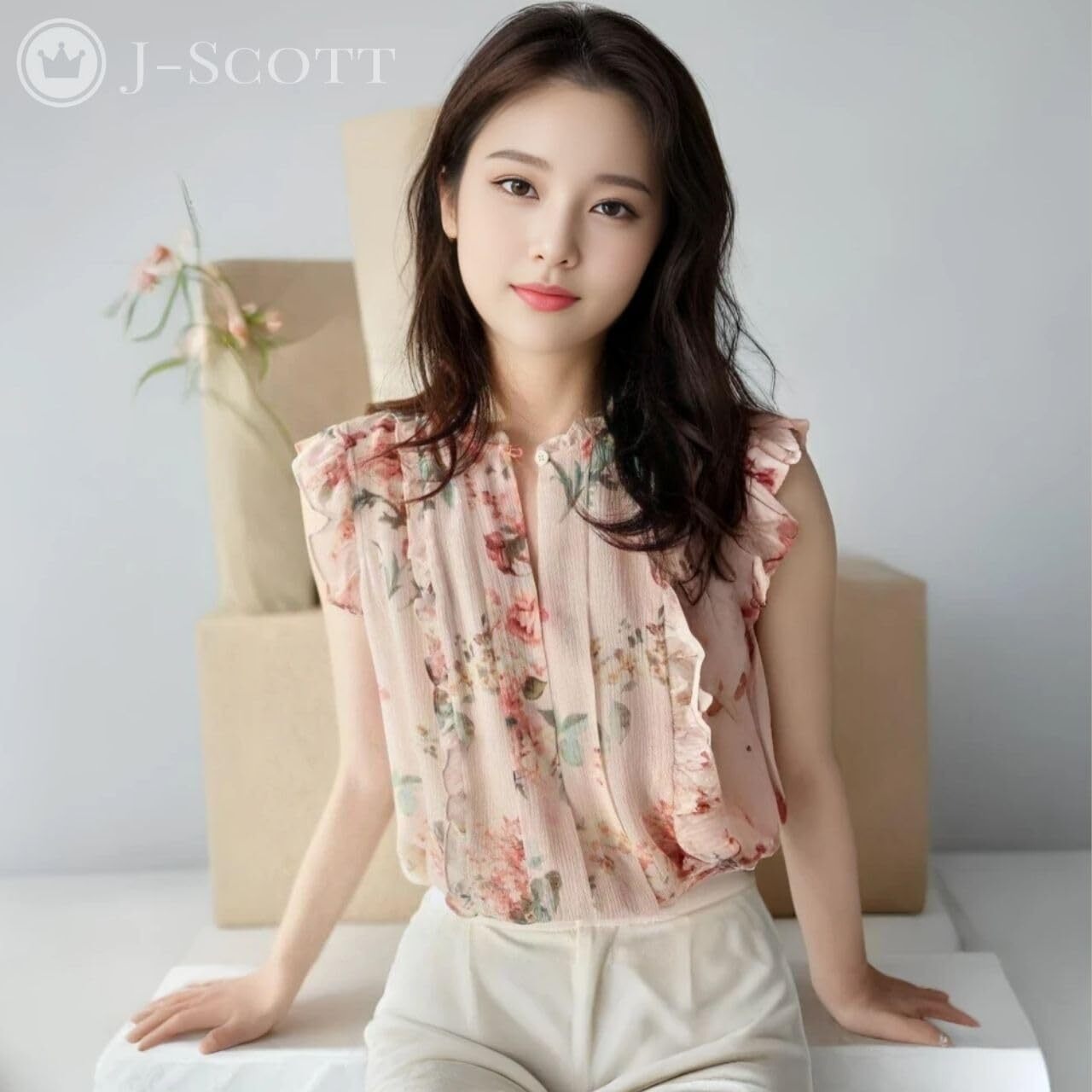 [J-Scott] [ジェイスコット] フリルブラウス シフォン フロントボタン スリットネック フリル袖 ノースリーブ 涼しげ レディース JS72