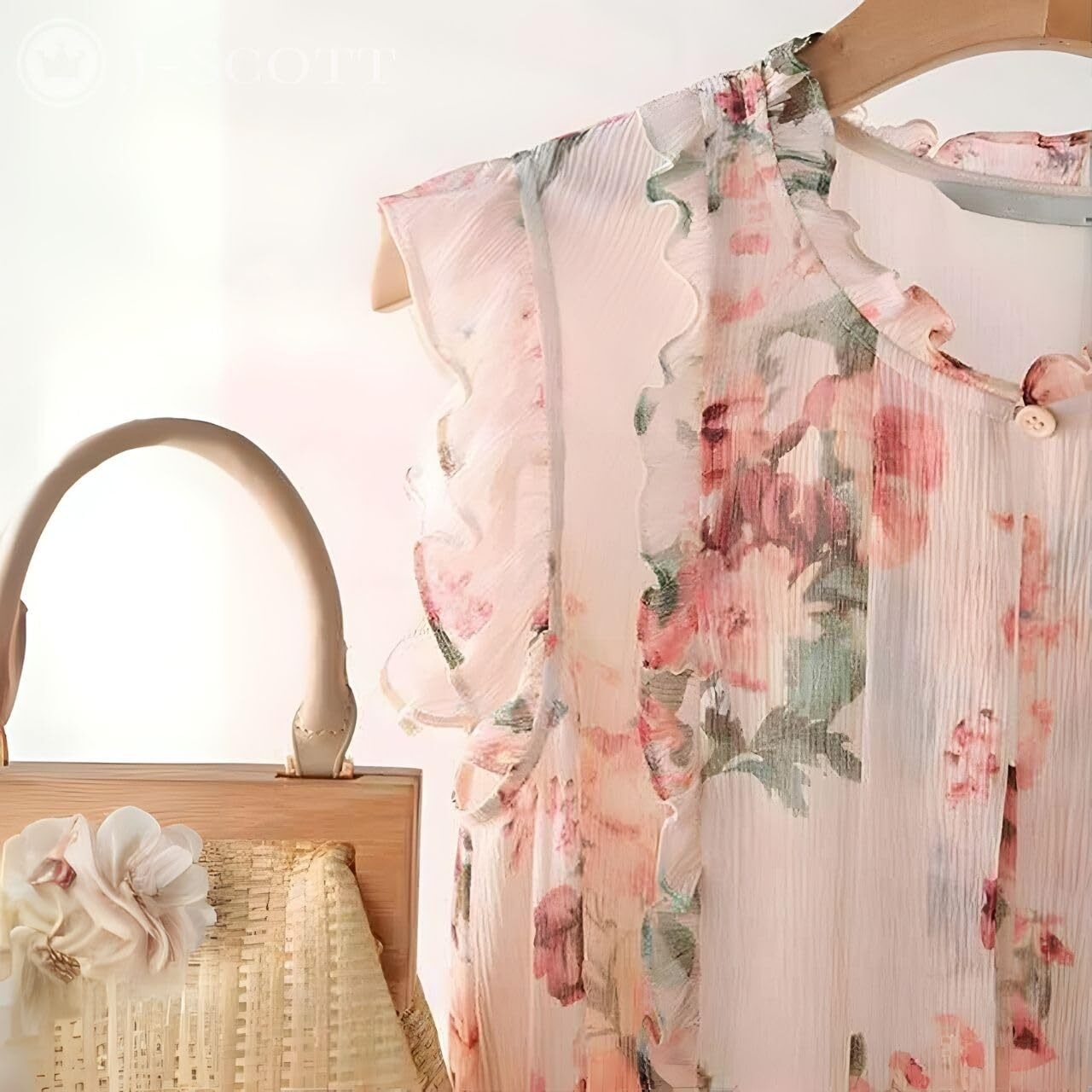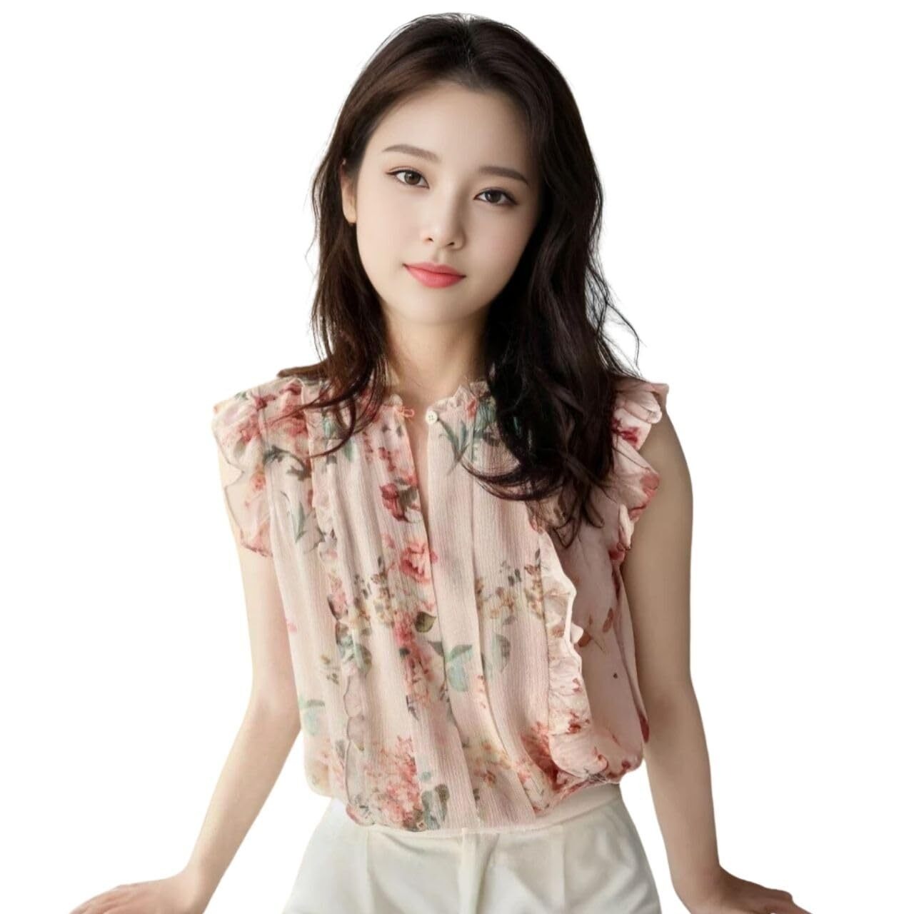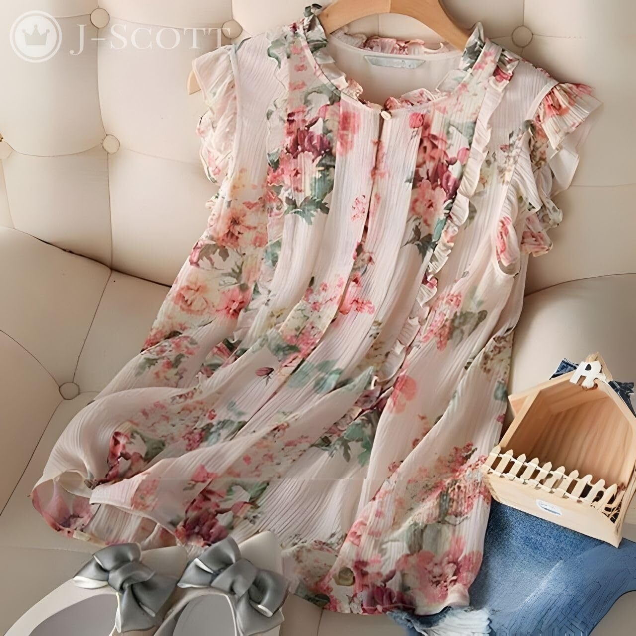 [J-Scott] [ジェイスコット] フリルブラウス シフォン フロントボタン スリットネック フリル袖 ノースリーブ 涼しげ レディース JS72