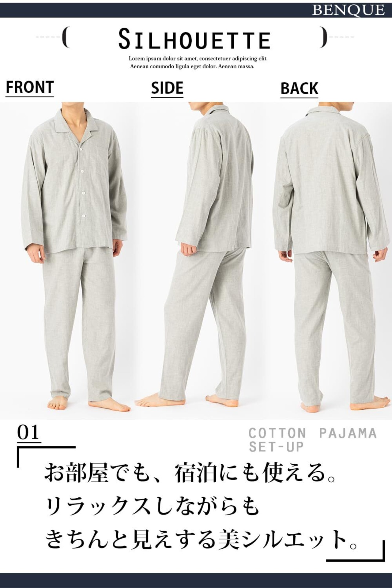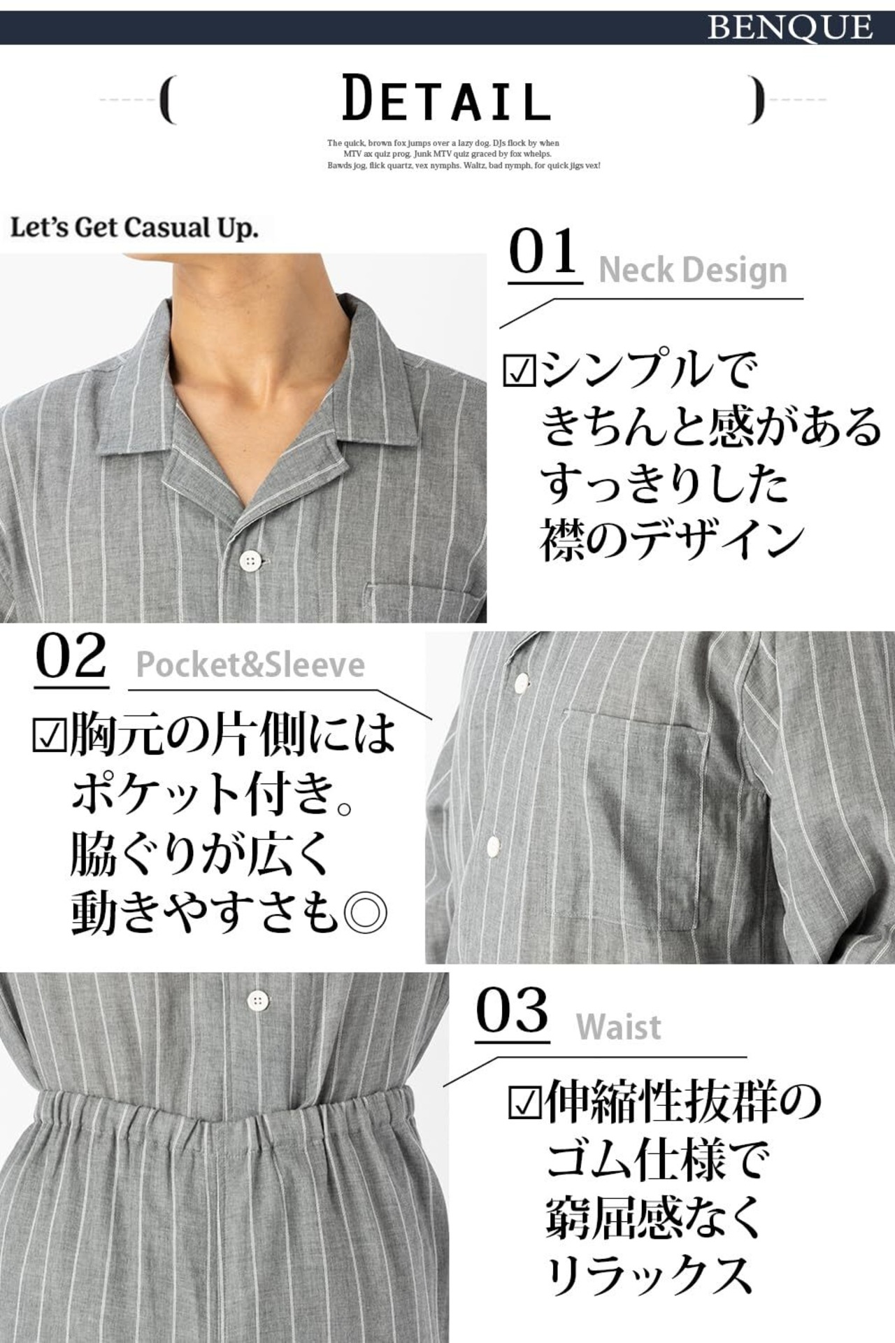 【きちんと見せる襟付きデザイン】清潔感があり、スタイリッシュな襟付きデザインなので朝のゴミ出しや、急な宅配便にもパジャマのままでOK!出張やお泊りにもおすすめです。