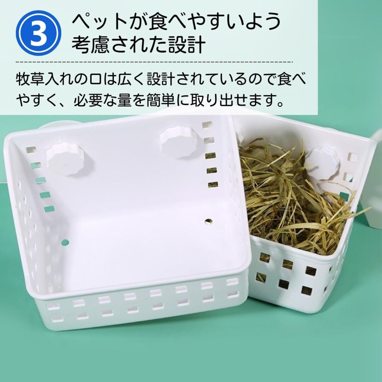 【リラックスして食事できる】牧草を食べるペットが食べやすいように設計しているので、自然な姿勢で食べることができます。