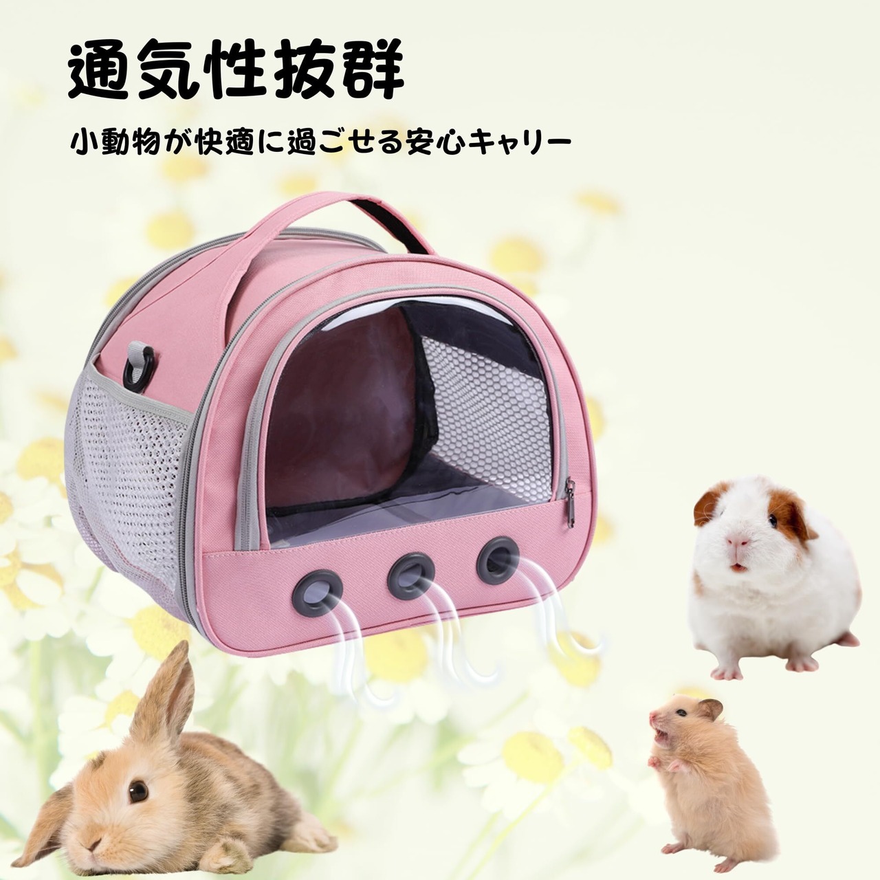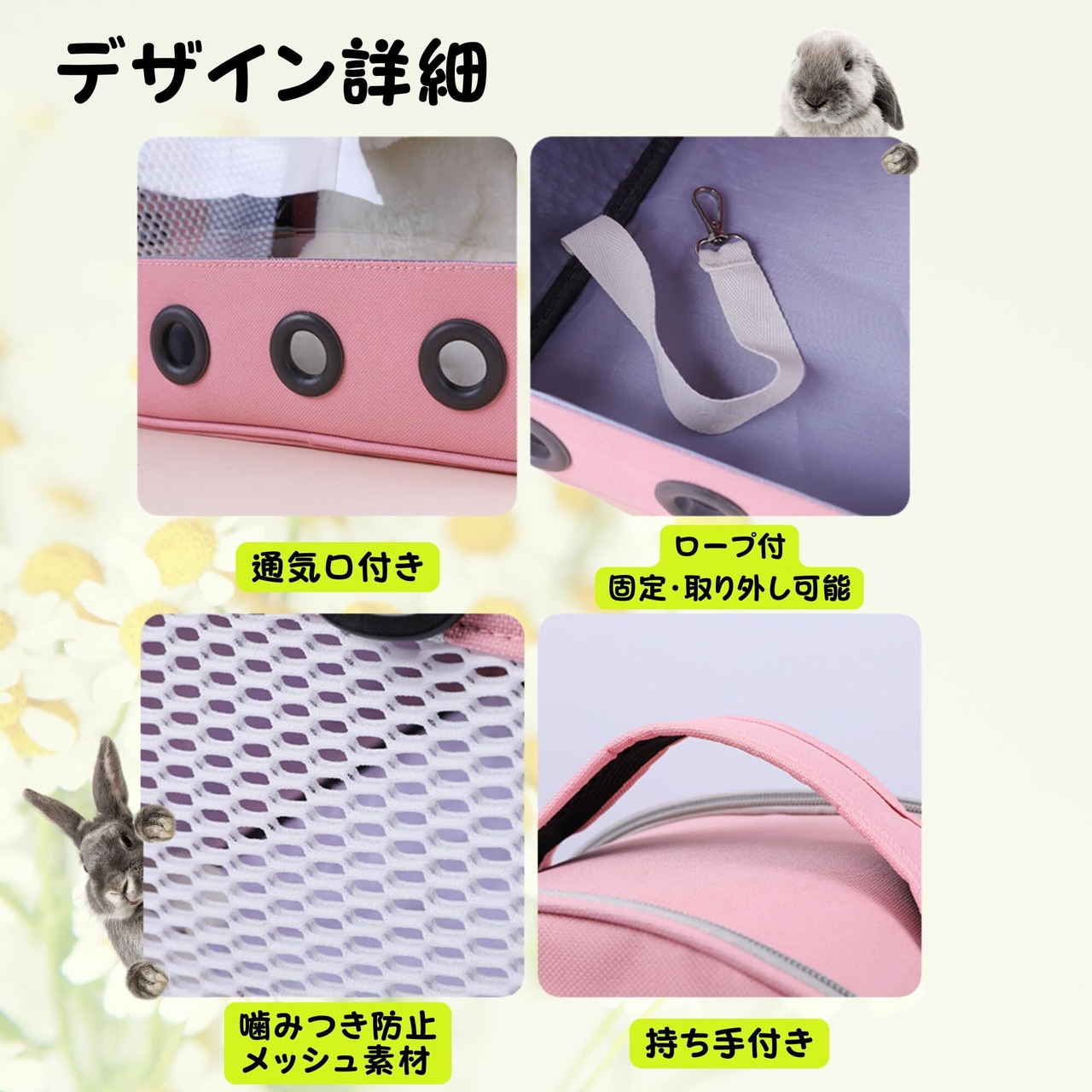 【快適な移動】この小動物キャリーバッグは、うさぎやモルモット、チンチラ、フェレット、子猫などの小動物が快適に移動できるように設計されています。通気性の良いメッシュ素材を使用しており、ペットが安心して過ごせる空間を提供します。