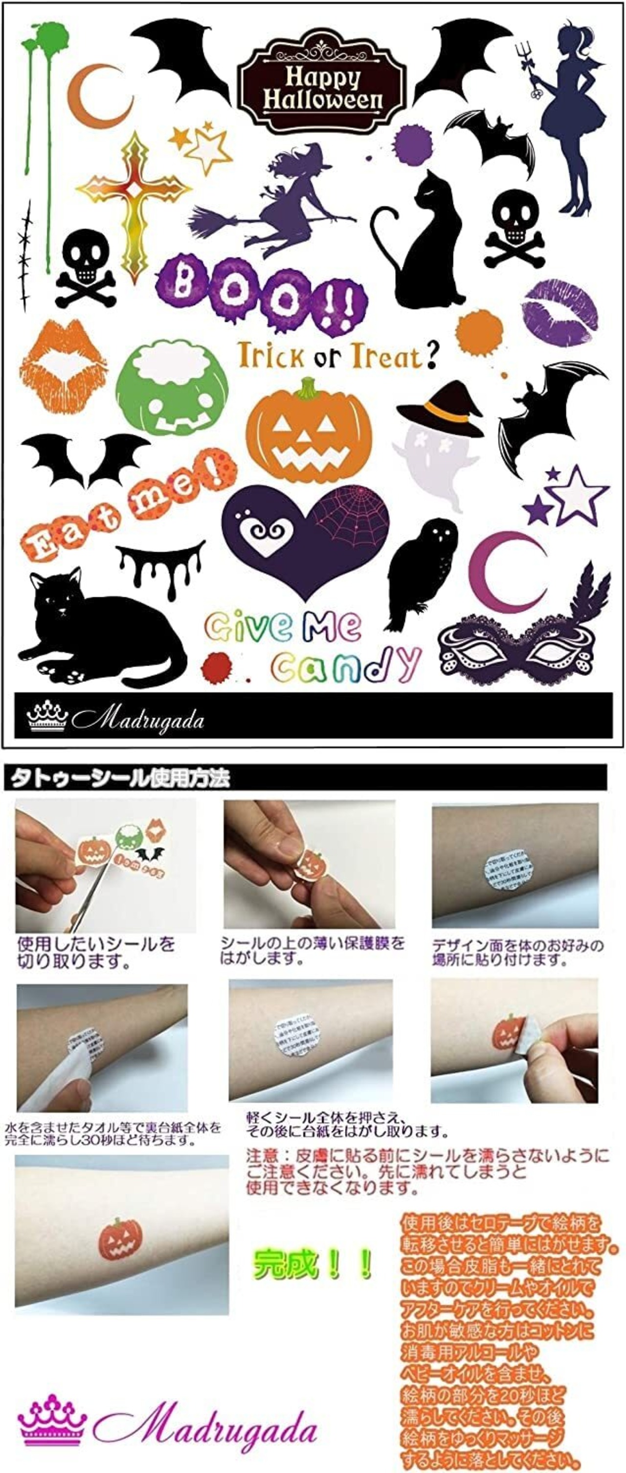 【プラス1】ハロウィンにかかせないキャラや文字がたっぷりのタトゥーシールがセットに! ハサミと水があればどこでも簡単に貼ることができます シールサイズ:縦152mm×横127mm
