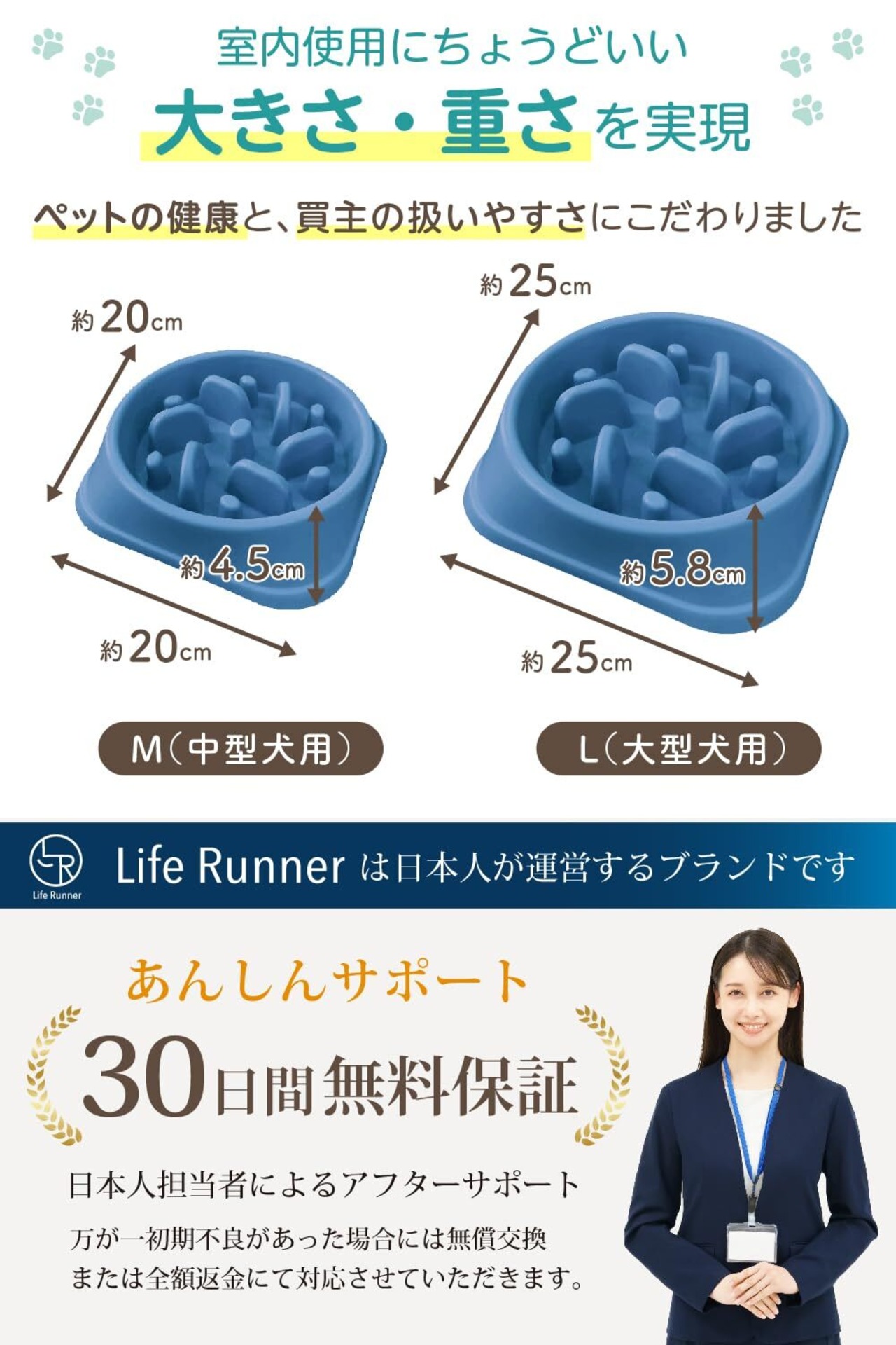 【商品仕様】Mサイズ:約20cm×20cm×4.5cm、Lサイズ:約25cm×25cm×5.8cm 室内使用にちょうどいい大きさ・重さを実現しました。ペットの健康と、買主の扱いやすさにこだわっています。※犬種によっては、口や舌の形状により、凹凸部分のエサがうまく食べられない場合があります。特にポメラニアンなど小型犬は、舌が届きにくいことがありますのでご確認ください。