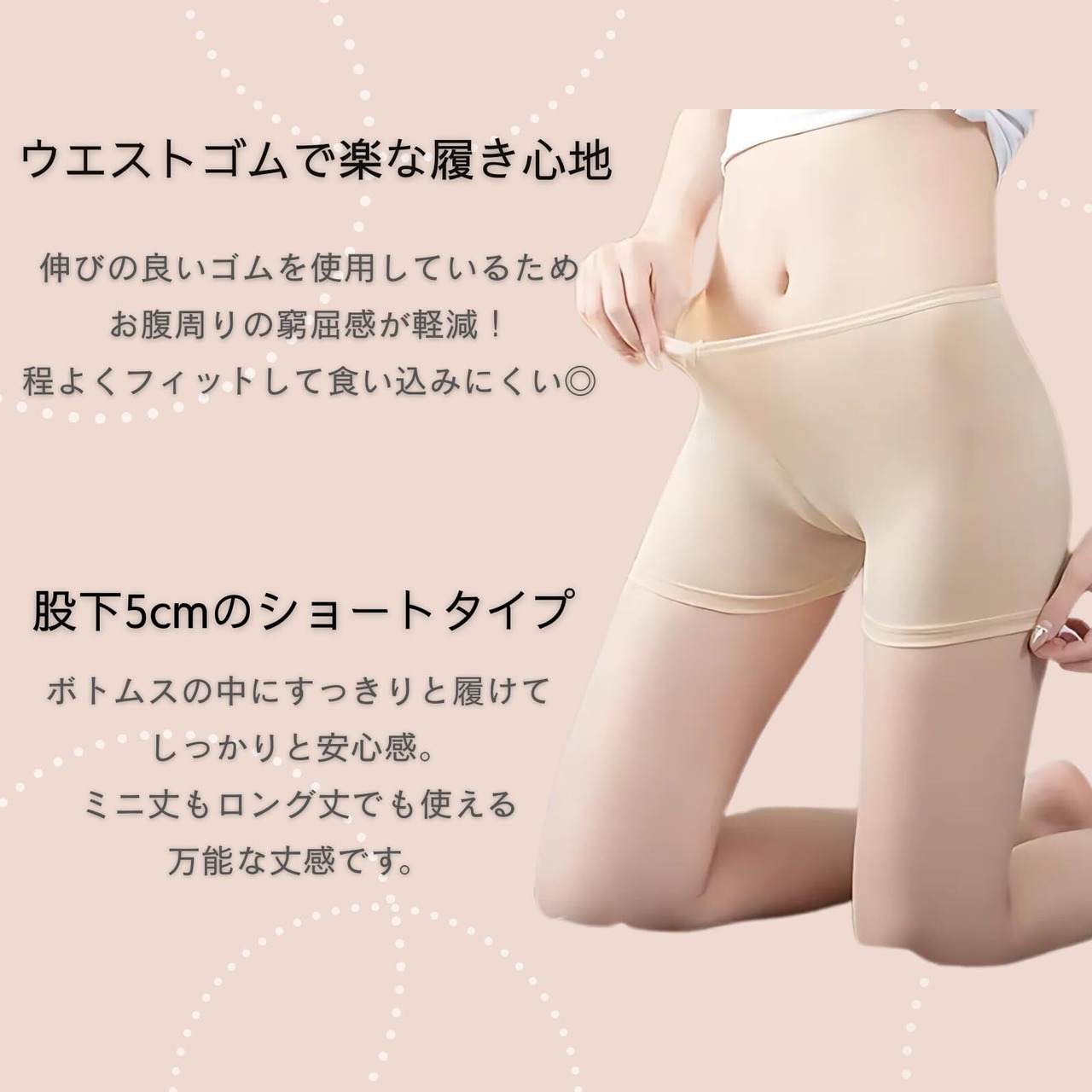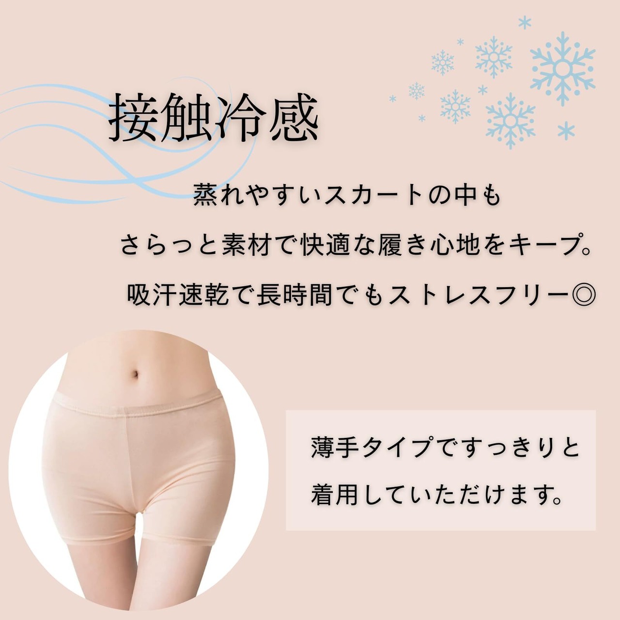 軽やかでムレにくいサラサラ素材のペチパンツワンピースやスカートの下にぴったりの短め仕様