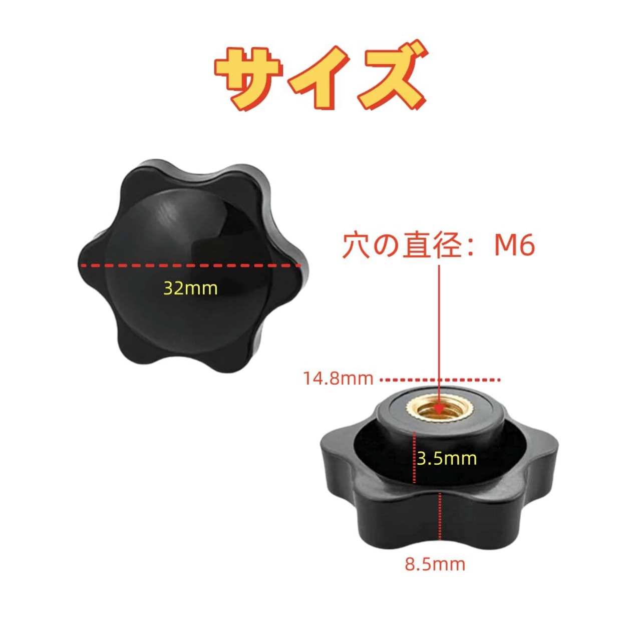 サイズ:12個セット;M5、ネジ径:約5mm、ヘッド径:約32mm、高: 約12mm;M6、ネジ径:約6mm、ヘッド径:約32mm、高: 約12mm;M8、ネジ径:約8mm、ヘッド径:約32mm、高: 約12mm