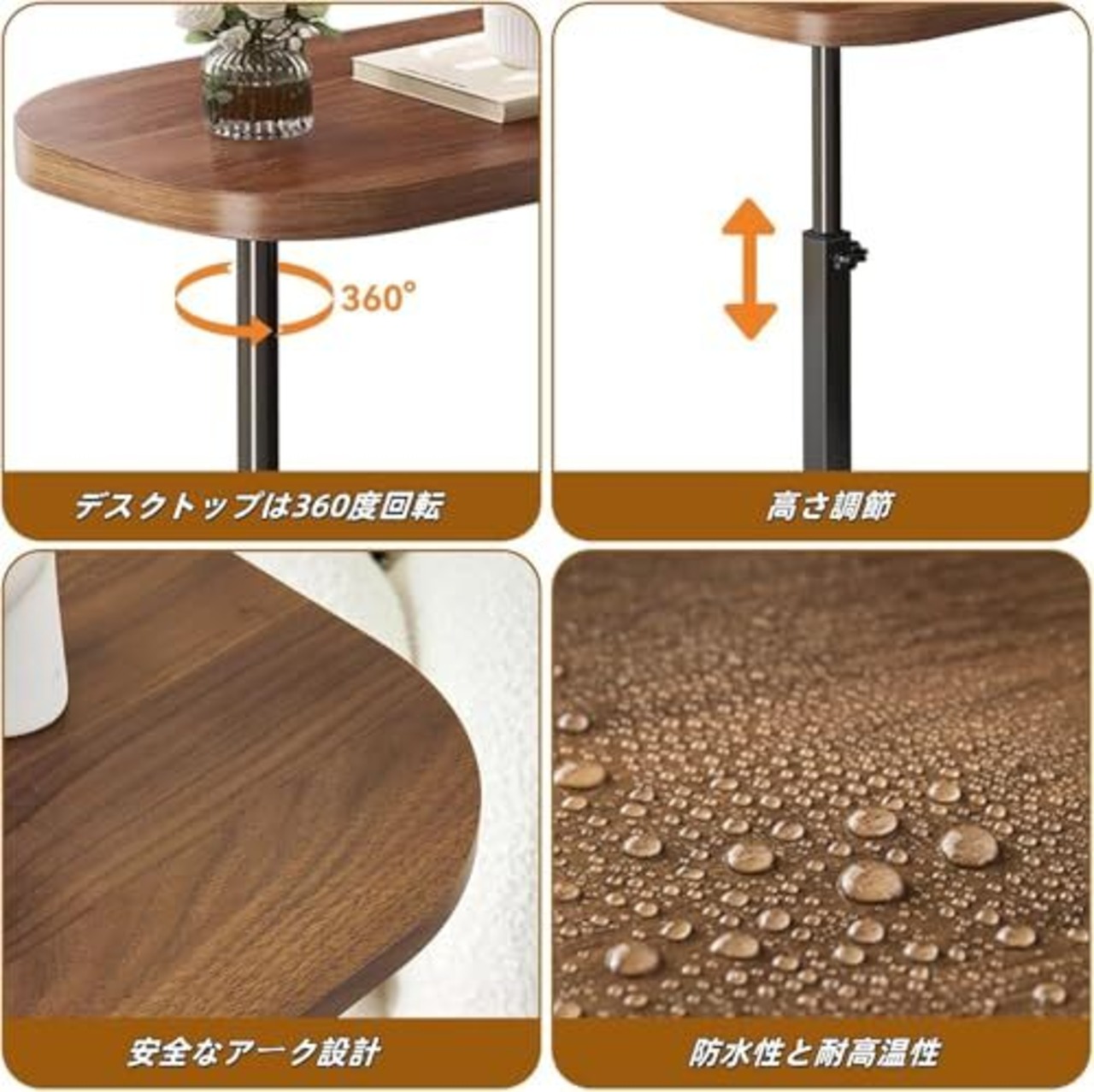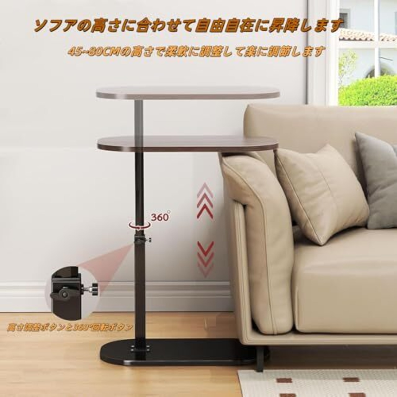【高さ調節可能 & 360°回転】スチールフレームリフティングロッドを採用し、45-80cmの範囲で高さは自由に調節できます。ソファやベッドなどの高さに応じてが設置できます。調節回転を回すだけなので、いつでも簡単に調整が可能。用途に応じて立ち作業と座り作業をスムーズに切り替えられます。デスクトップは360度回転できます。お好みの方向に自由に調整できます。