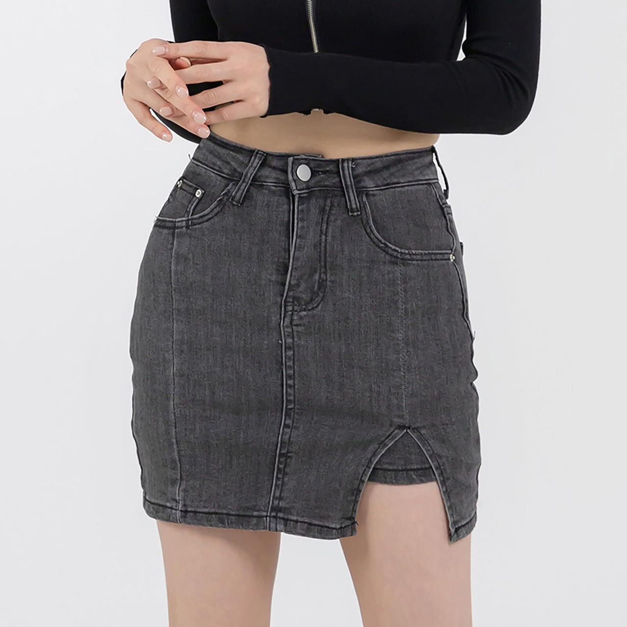 前スリット入りのセクシーなデザインが魅力的なデニムミニスカート。