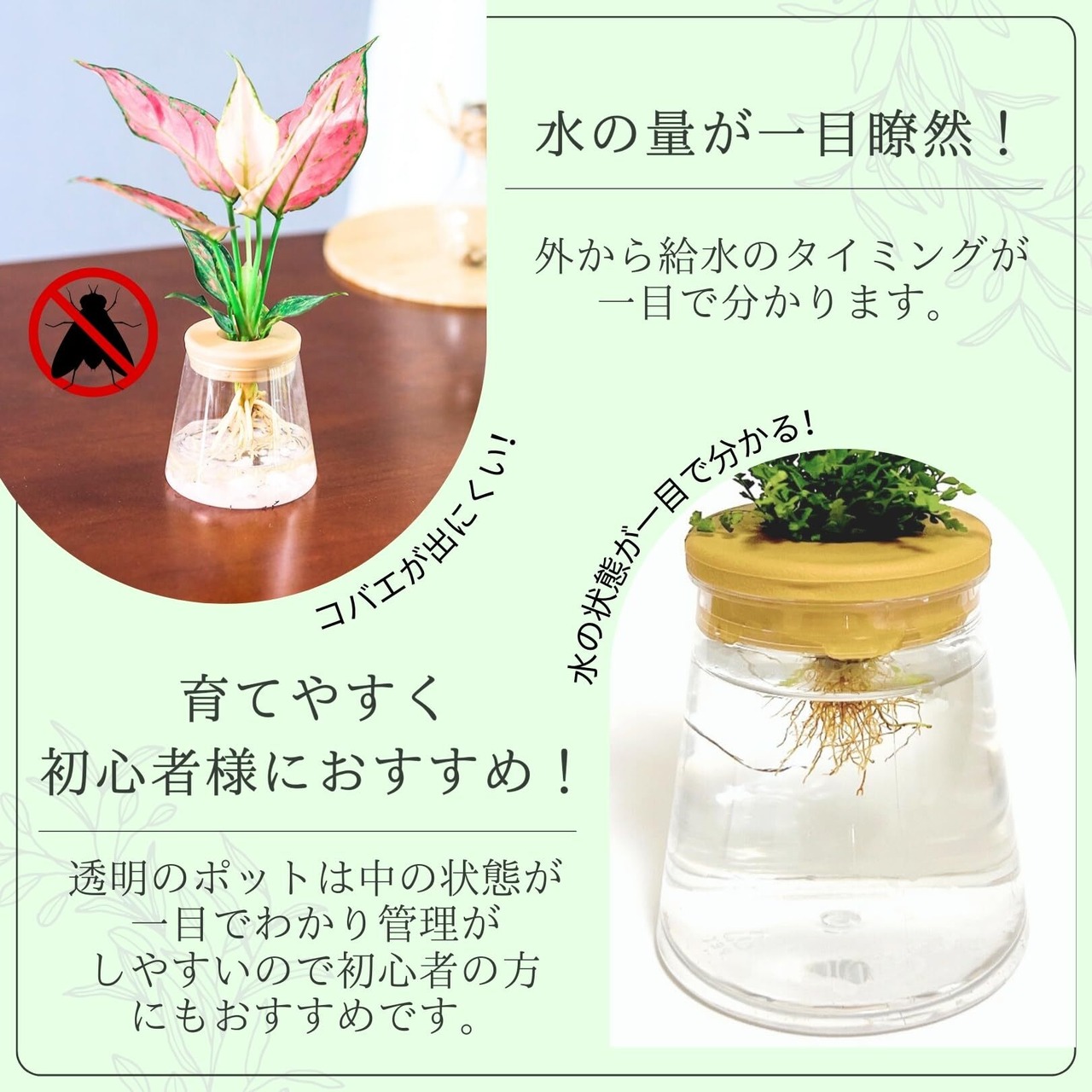 土の有機物が原因のコバエなどが出にくく、透明のポットは水の状態が一目でわかり管理がしやすいので初心者様にもおすすめです。