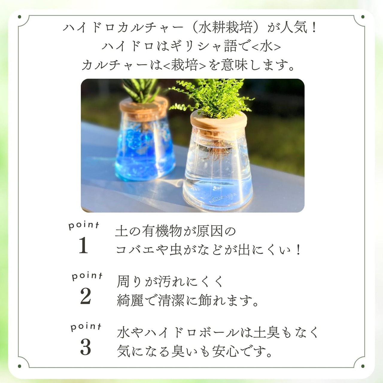 土を使わず衛生的に植物を育てることができる、ハイドロカルチャー(水耕栽培)が人気です。ハイドロはギリシャ語で<水>、カルチャーは<栽培>を意味します。