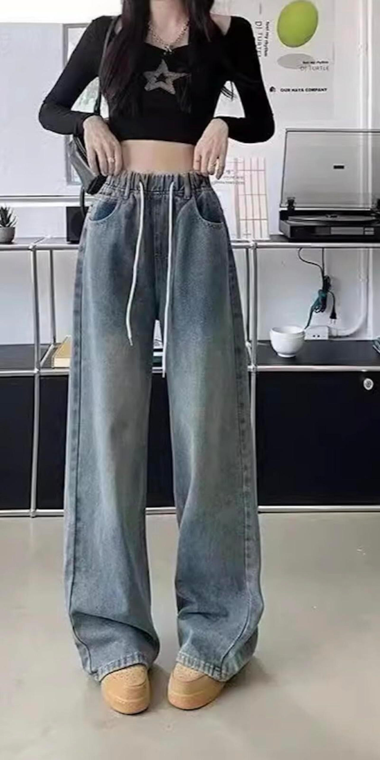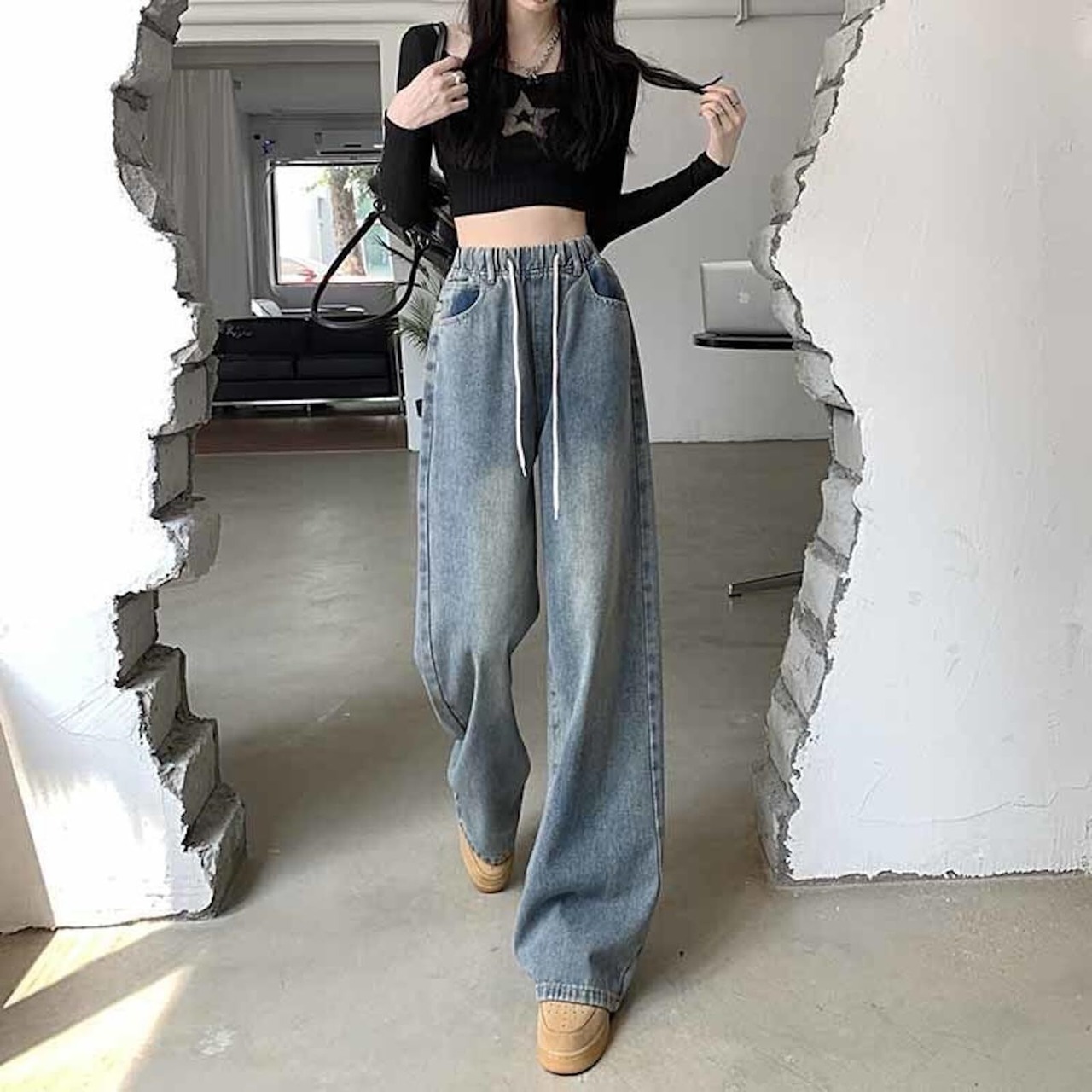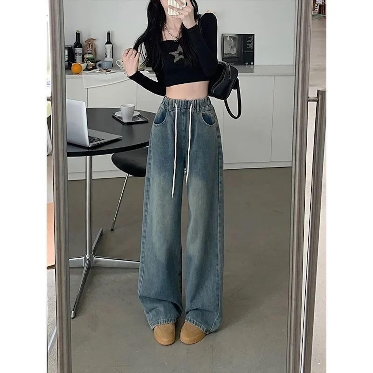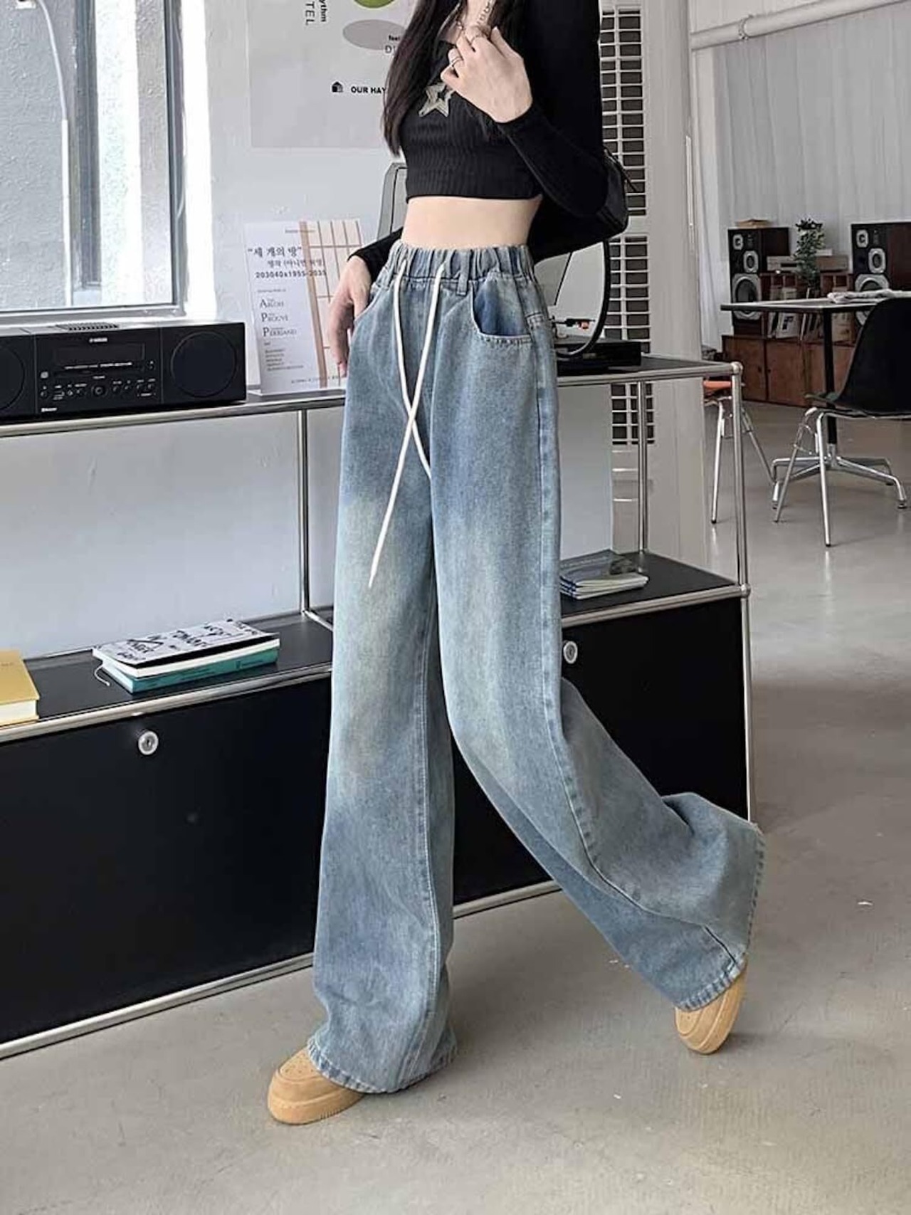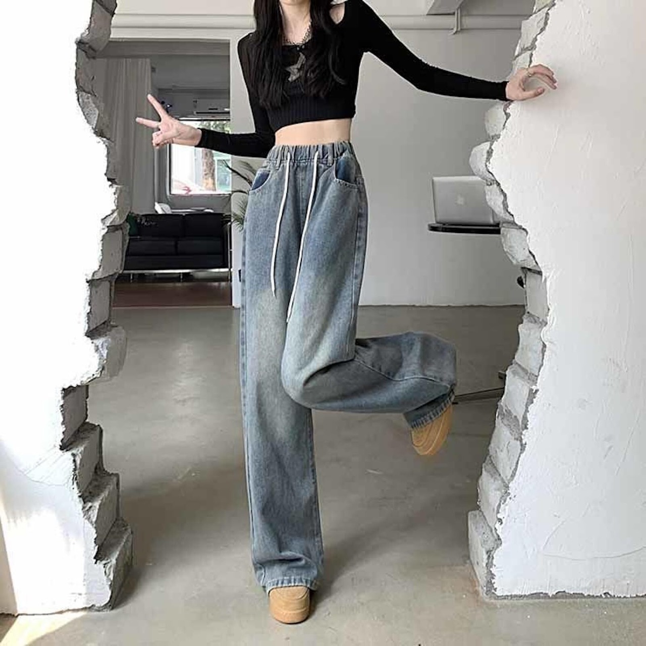 [WesRiva] アーバンクラウド デニム ルーズ ワイド ボトムス ズボン レディース ウエスト ゴム 紐 シンプル 無地 カジュアル 韓国風 韓流