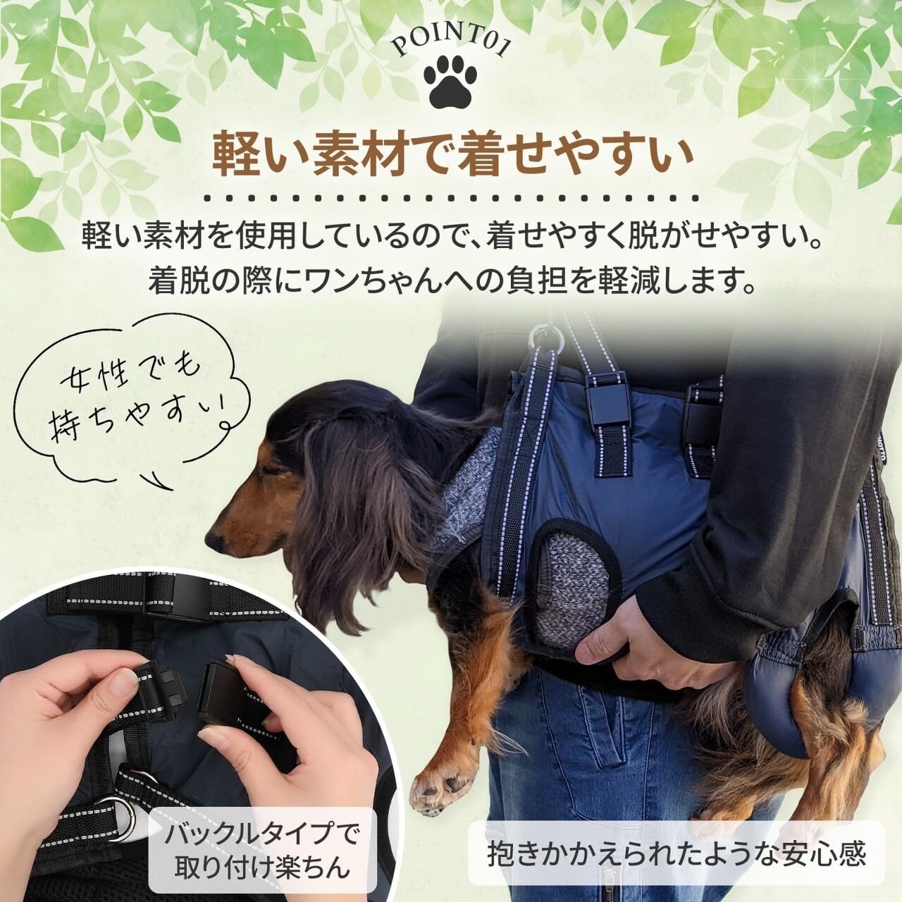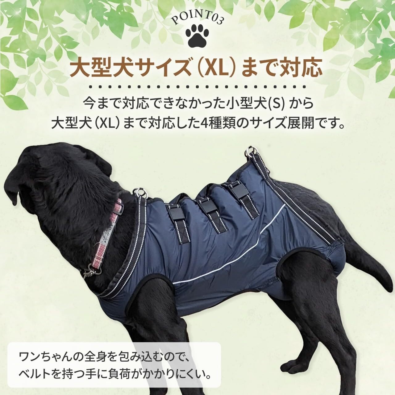 【胴衣型だから、体への圧迫感が軽減】 細いベルトタイプとは異なり、ワンちゃんの身体を包み込むので、飼い主様に抱きかかえられたような安心感があります。体への圧迫感を抑え、心理的・物理的にワンちゃんの負担を軽減します。着脱が簡単:バックル式で着脱がラクラク。 快適な着用感:軽量で通気性の高い素材を使用しており、ワンちゃんが快適に着用できます。